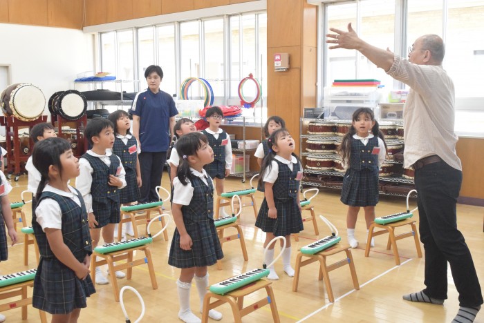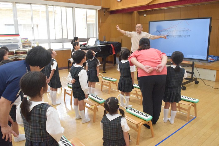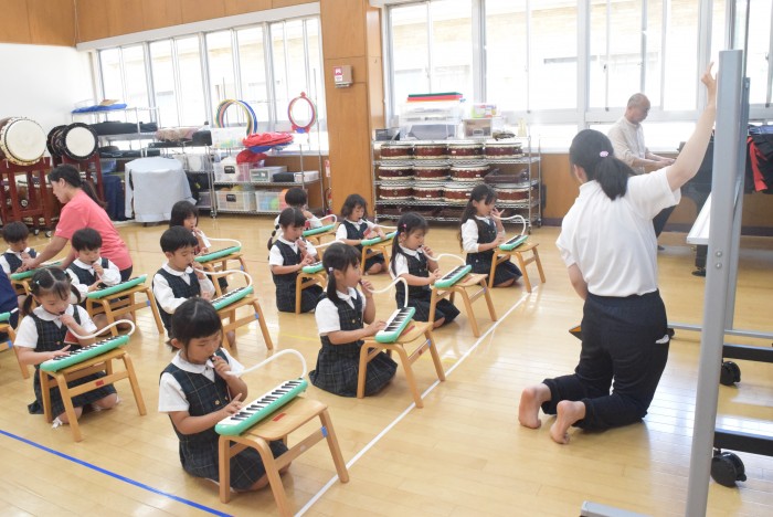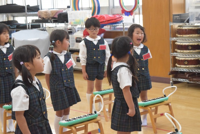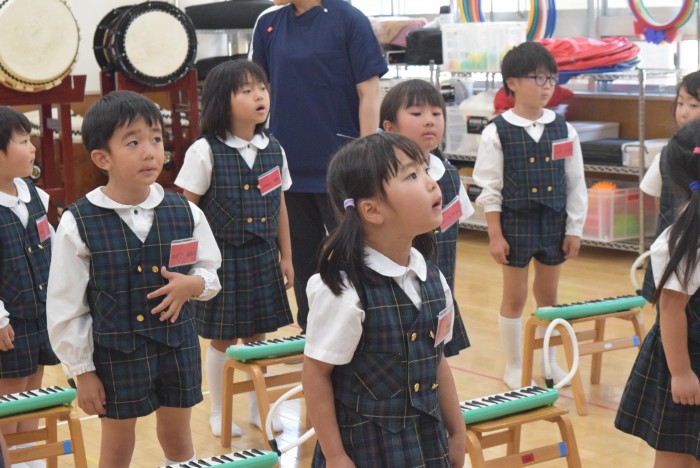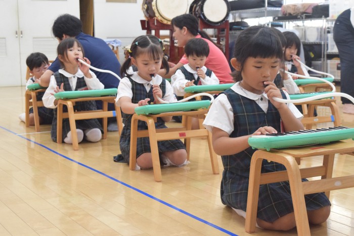 ピアノの音に合わせて、発声練習を行ったり、指をくぐらせて鍵盤ハーモニカを吹く練習を行いました。