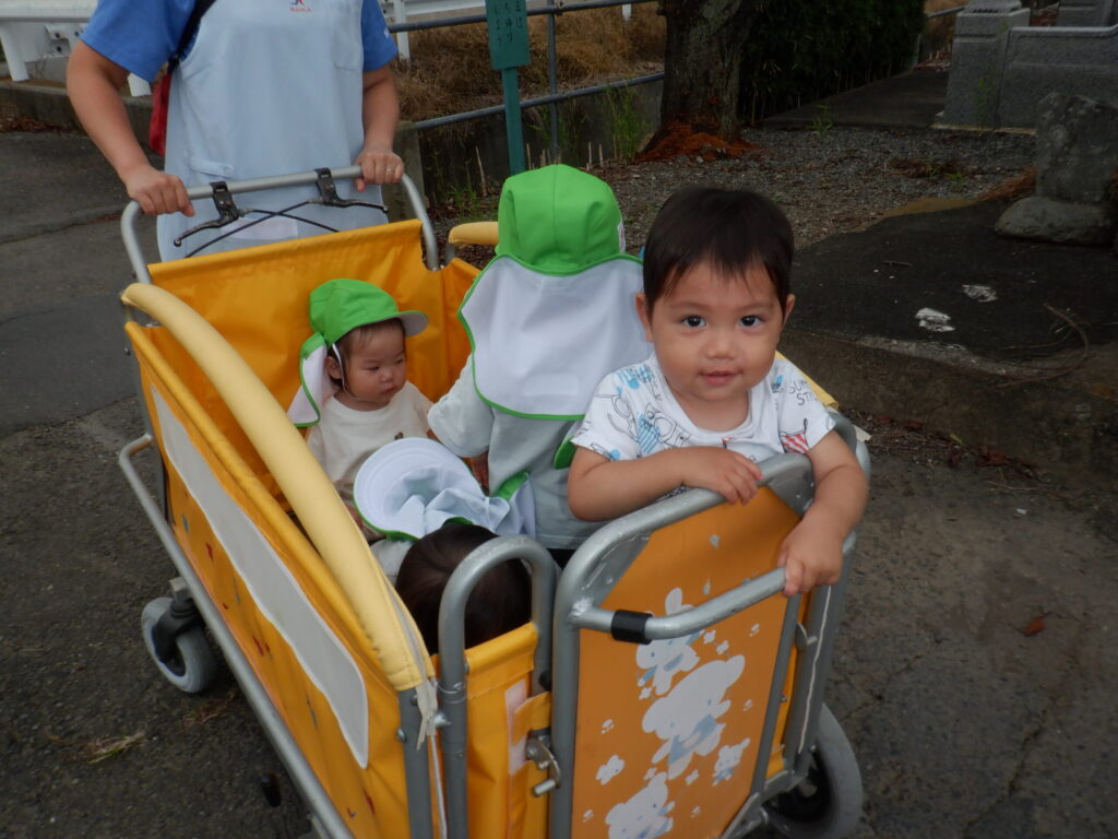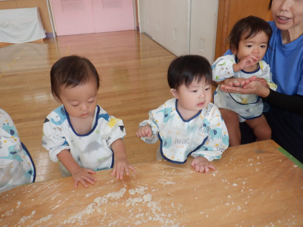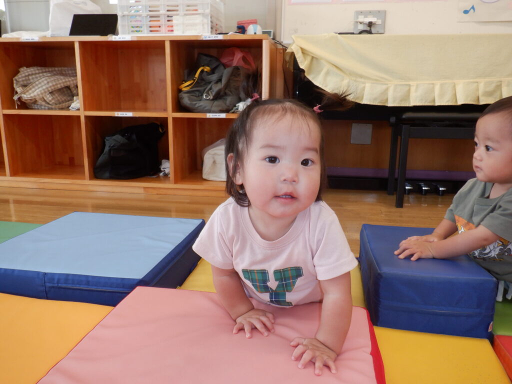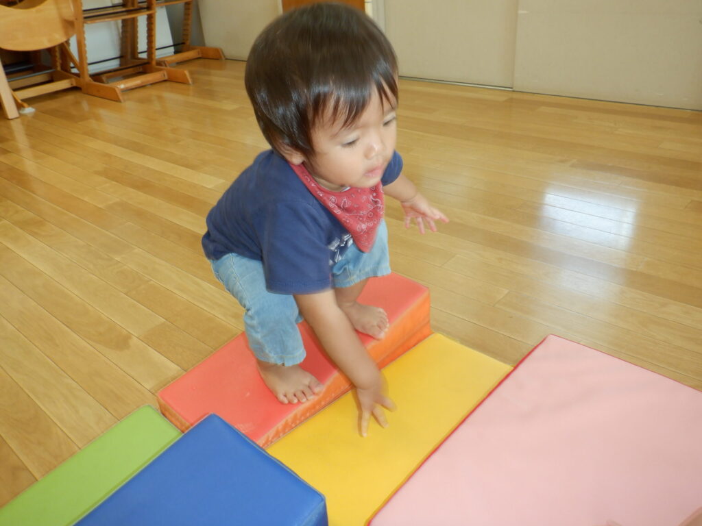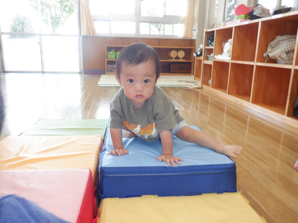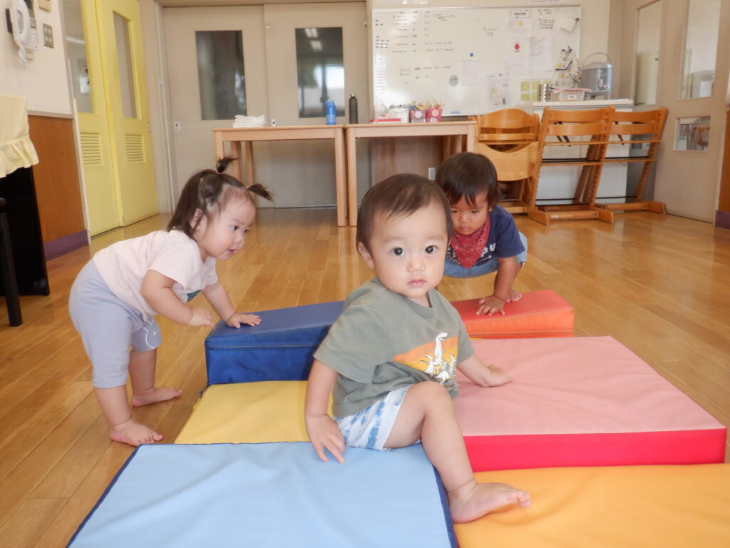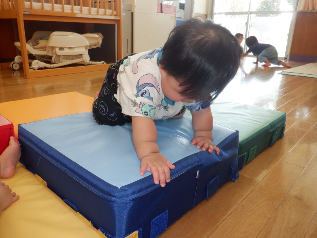 凸凹マットで遊びました。高さや硬さがバラバラのマットをハイハイや歩いて乗り越えたりして遊びました。柔らかいマットの上に1人でまだ歩けない子も先生と手を繋いで歩いたり、手や足でマットの感触の違いを感じたりしながらたくさん遊びました。
