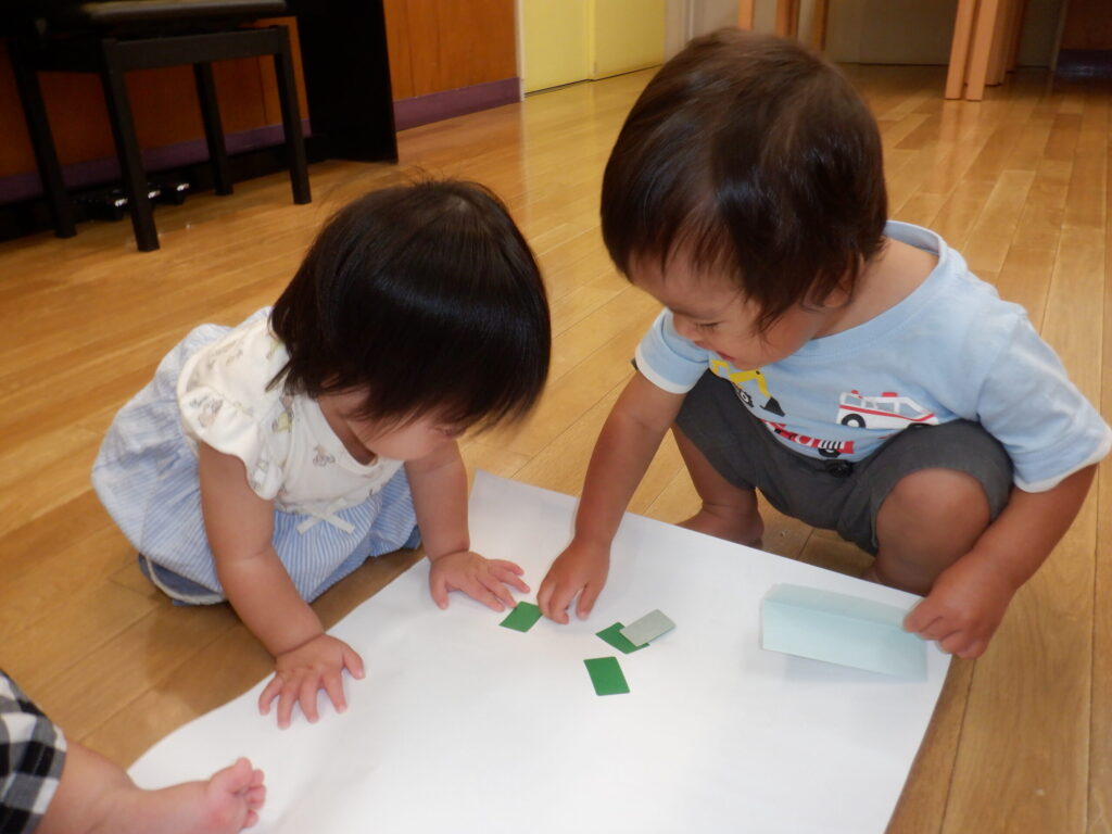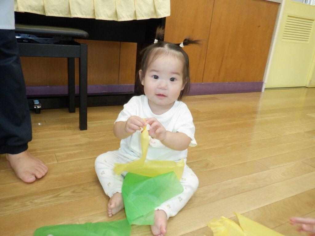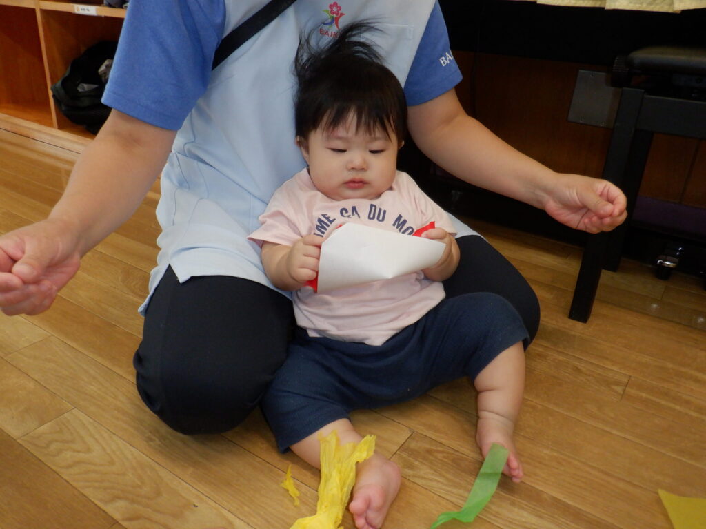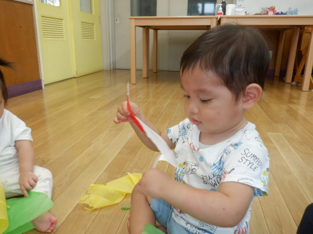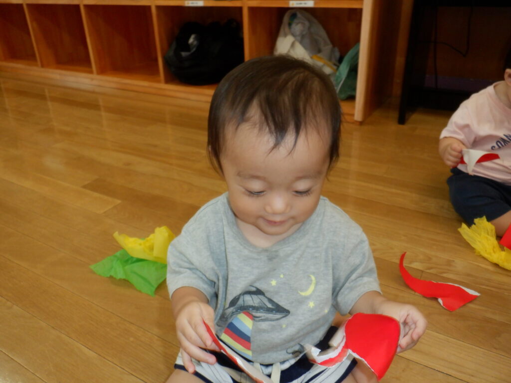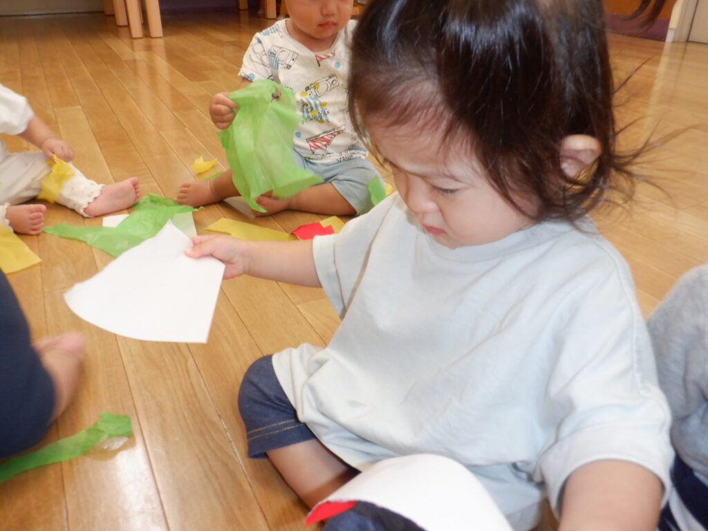 お花紙や折り紙、画用紙など色々な紙を破いて遊びました。柔らかいお花紙を細かくちぎったり、少し切込みを入れた折り紙や画用紙を両手を広げて破いたり、ぐしゃっと握ったりして遊びました。画用紙の感触が好きな子、お花紙の感触が好きな子と子どもによっても好みがバラバラで、自分の気に入った紙でたくさん遊びました。