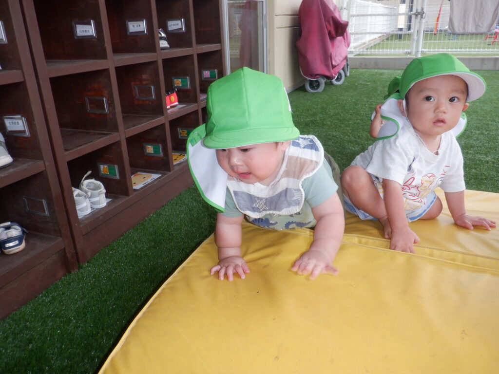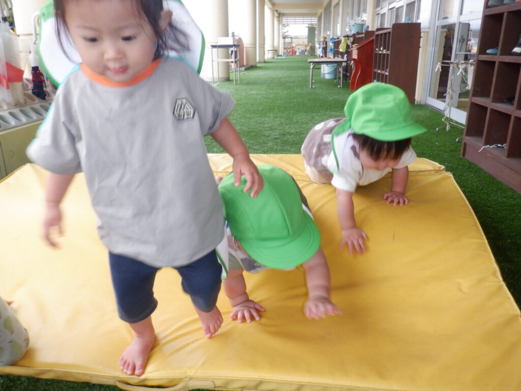 テラスでマット遊びをしました。少し急な坂をハイハイやあんよで登る子どもたち。手足の力がついてきて、スムーズに登れるようになりました。