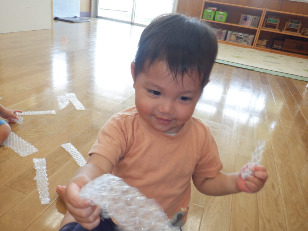 梱包材であそびました。プチプチと鳴る音を楽しんだり、ビリビリと破いたりして遊びました。破いた欠片を上から落として、ヒラヒラ落ちてくるのを目で追ったり、ぎゅっと握って柔らかい感触を楽しんでいました。最後のお片付けもとっても上手にできました。