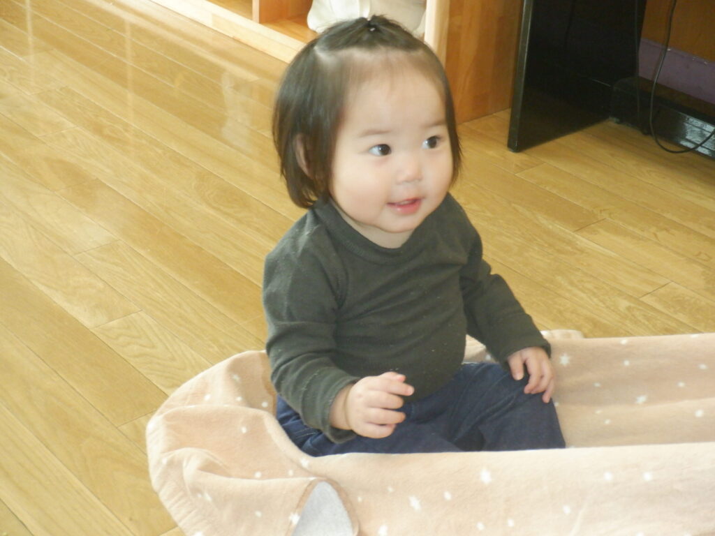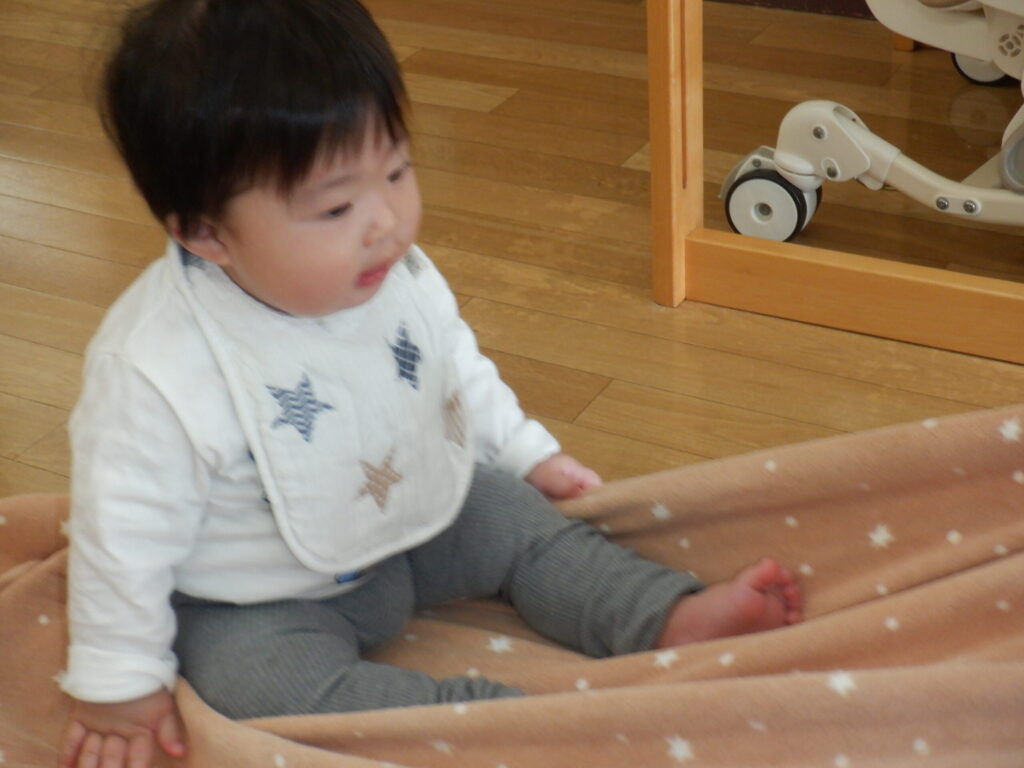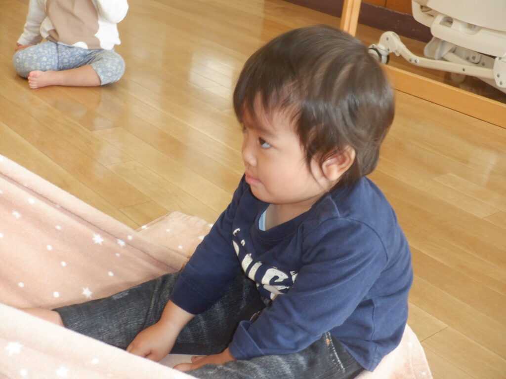 タオルタクシーをして遊びました。後ろに倒れないようにうまくバランスを取りながら座っていたつくし組の子どもたち。スピードをあげても、カーブしても頑張って座っていられるようになりました。