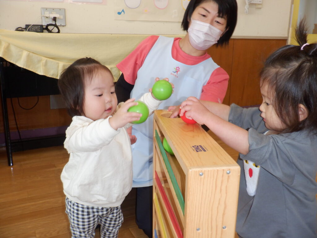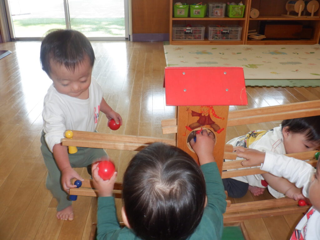 追視のおもちゃで遊びました。コロコロ転がるボールをよく目で追っていた子どもたち。ボールが通るたびに鳴る鈴の音が聞きたくて何度も転がしたり、ボールを穴に入れるのが楽しくて何度も入れたりして遊んでいました。