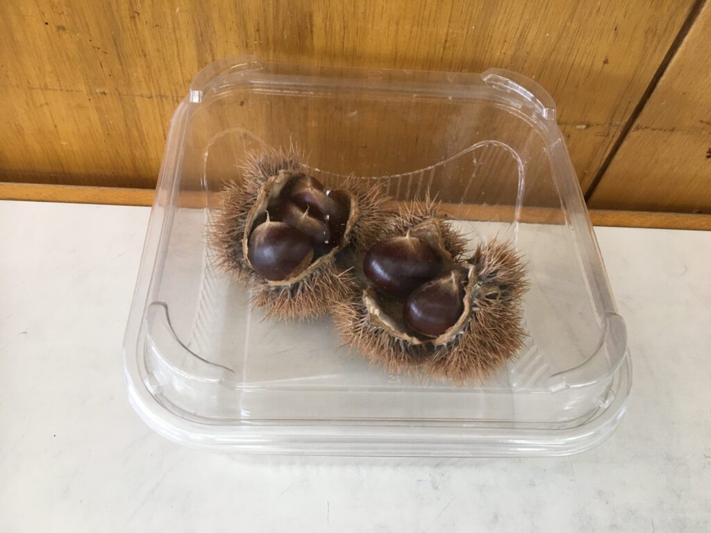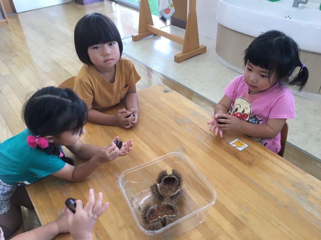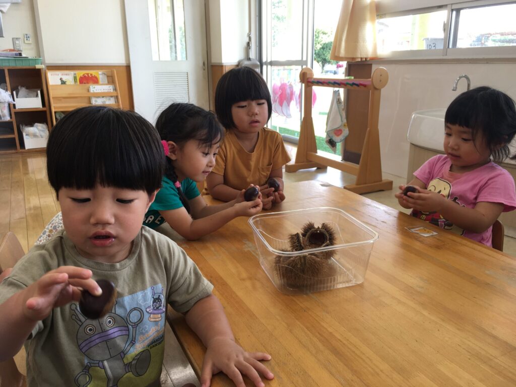 茶色のツンツン・トゲトゲした栗に興味津々なすみれ組さん。