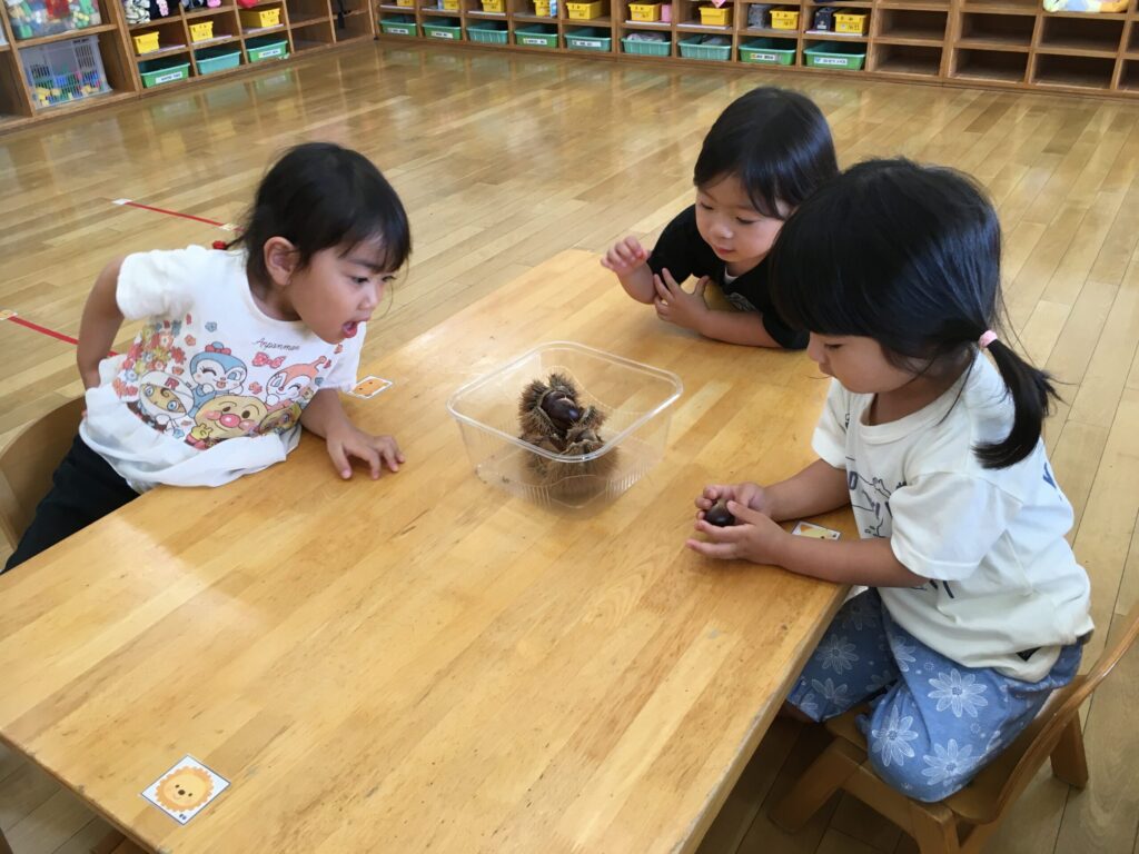 茶色のツンツン・トゲトゲした栗に興味津々なすみれ組さん。