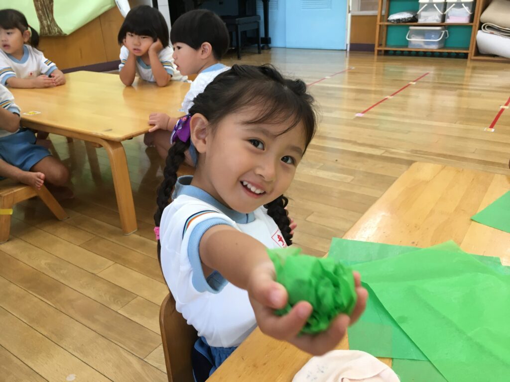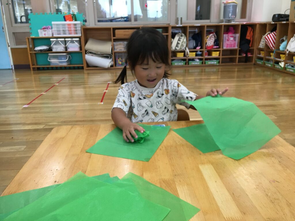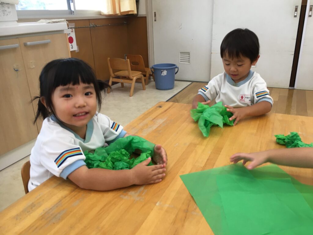 まず、緑のお花紙を優しくクシュクシュまるめました。