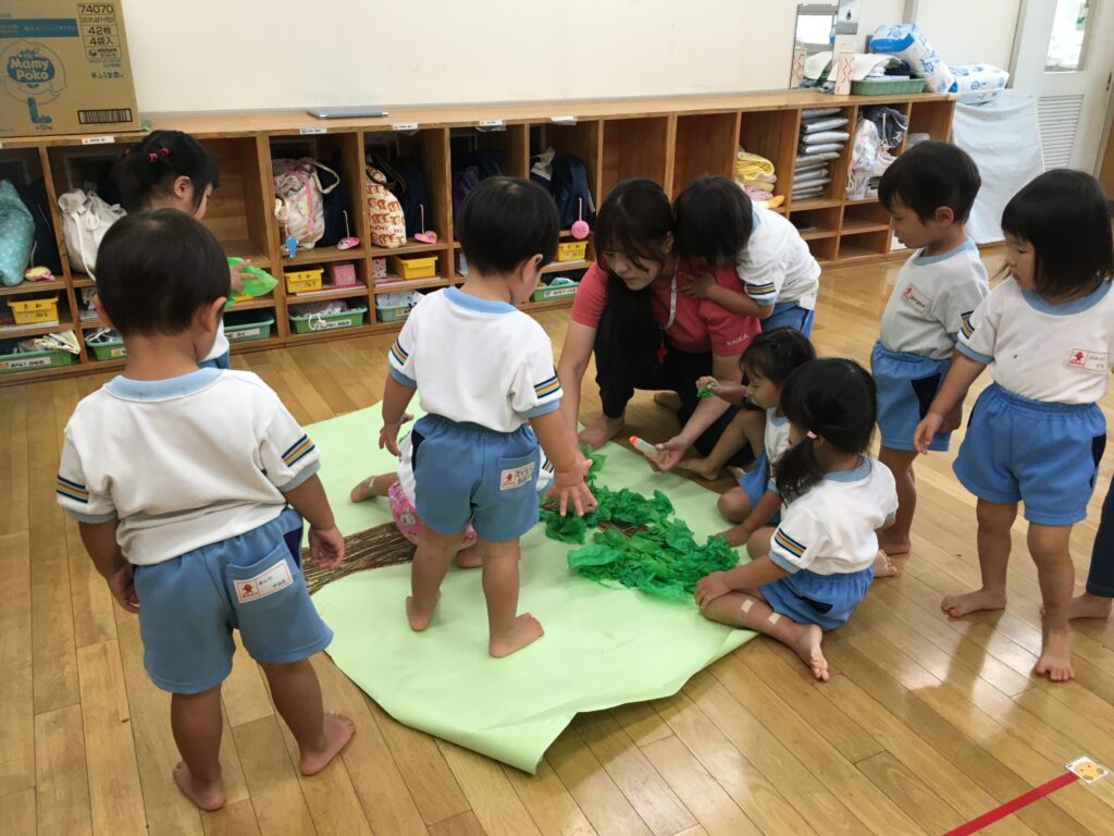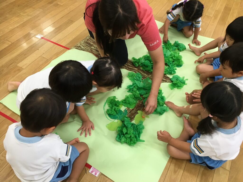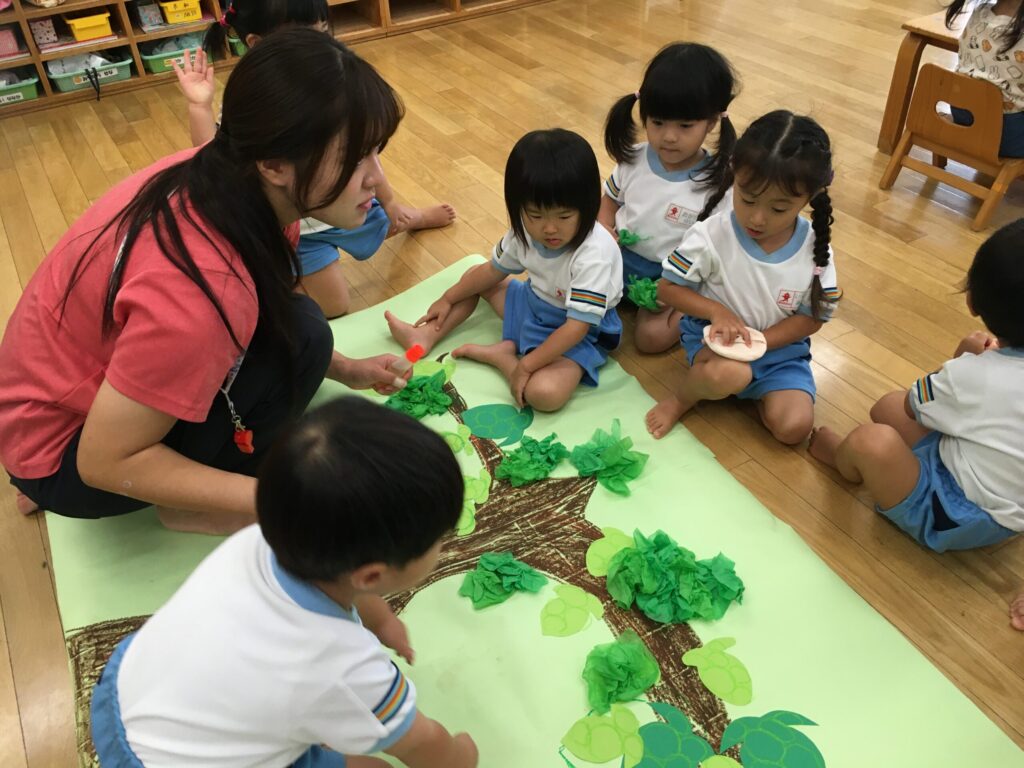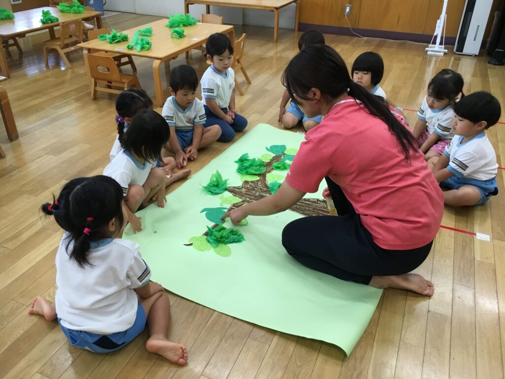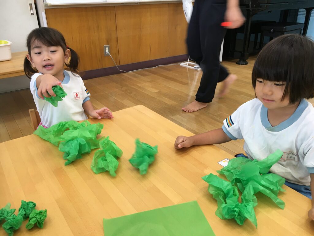 「先生がのりを塗ったところに葉っぱを貼るんだよ!」と声をかけながら先生がのりをつけると、すぐに自分の持っているお花紙を楽しんで貼りつけていました。