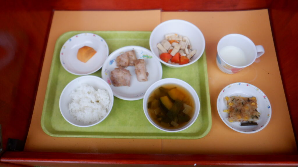 ◎今日はかぼちゃ、チンゲン菜、長ネギが入った、みそ汁です。