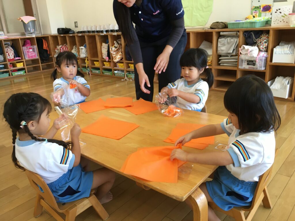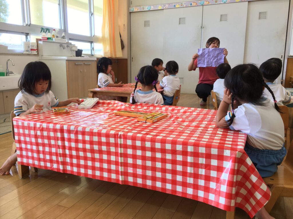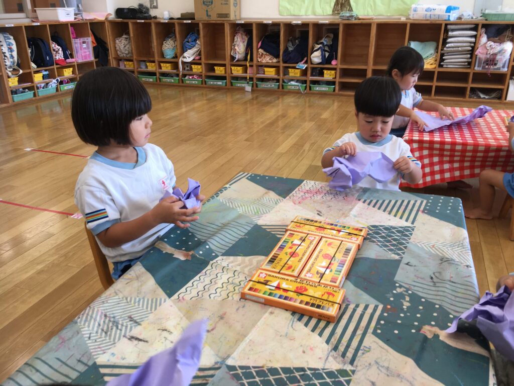 先生から画用紙を受け取ると、とても嬉しそうにくしゅくしゅと丸めていました。