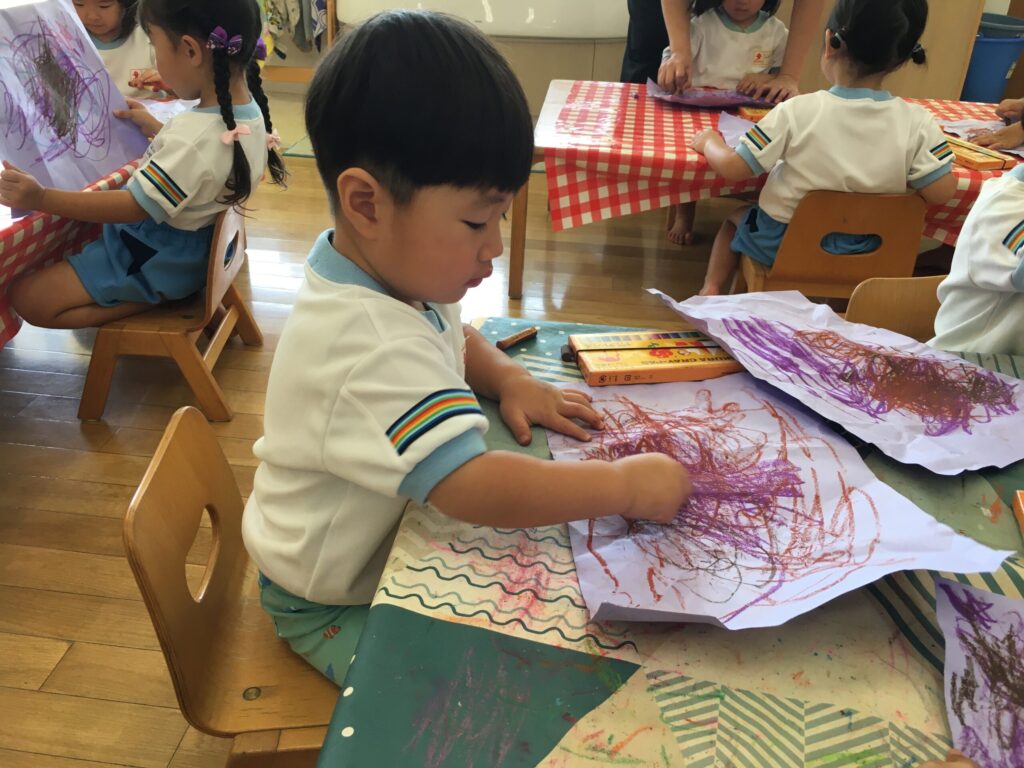 たくさんクレヨンでなぐり描きできると、「できた!」「おしまい!」と嬉しそうに言いながら自分で先生に言われずとも片付けを始める姿が印象的でした。