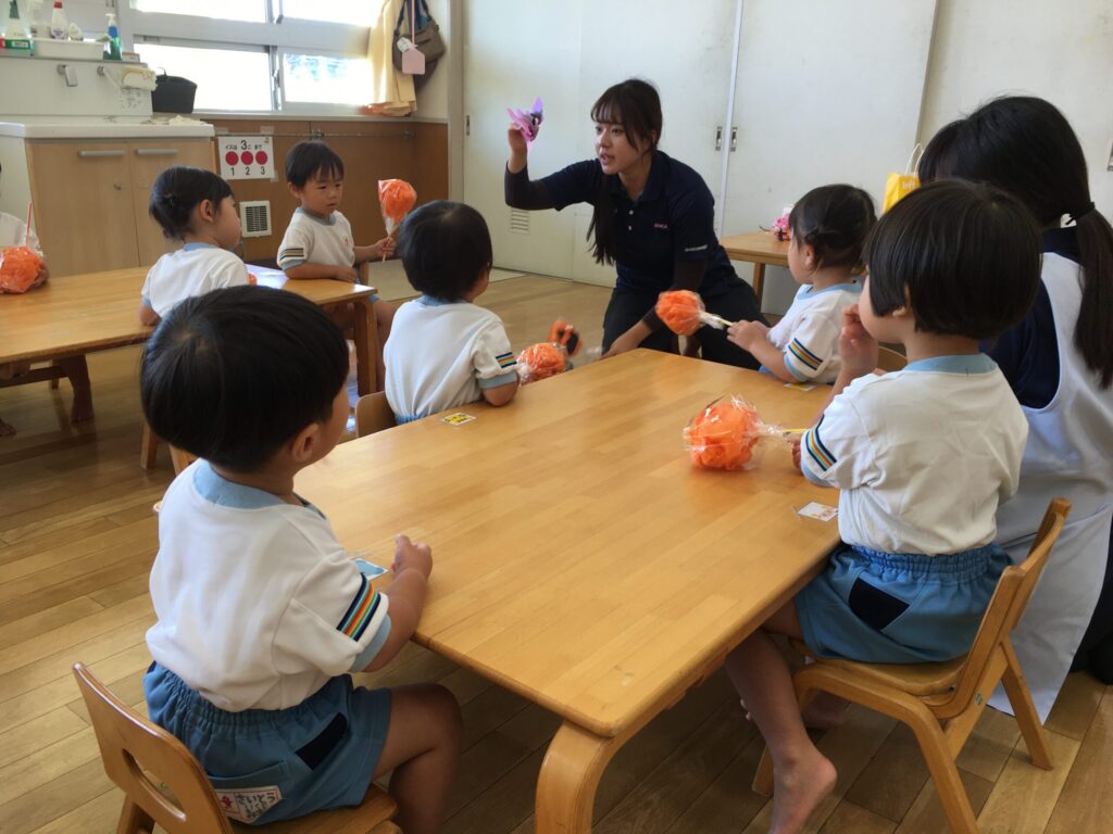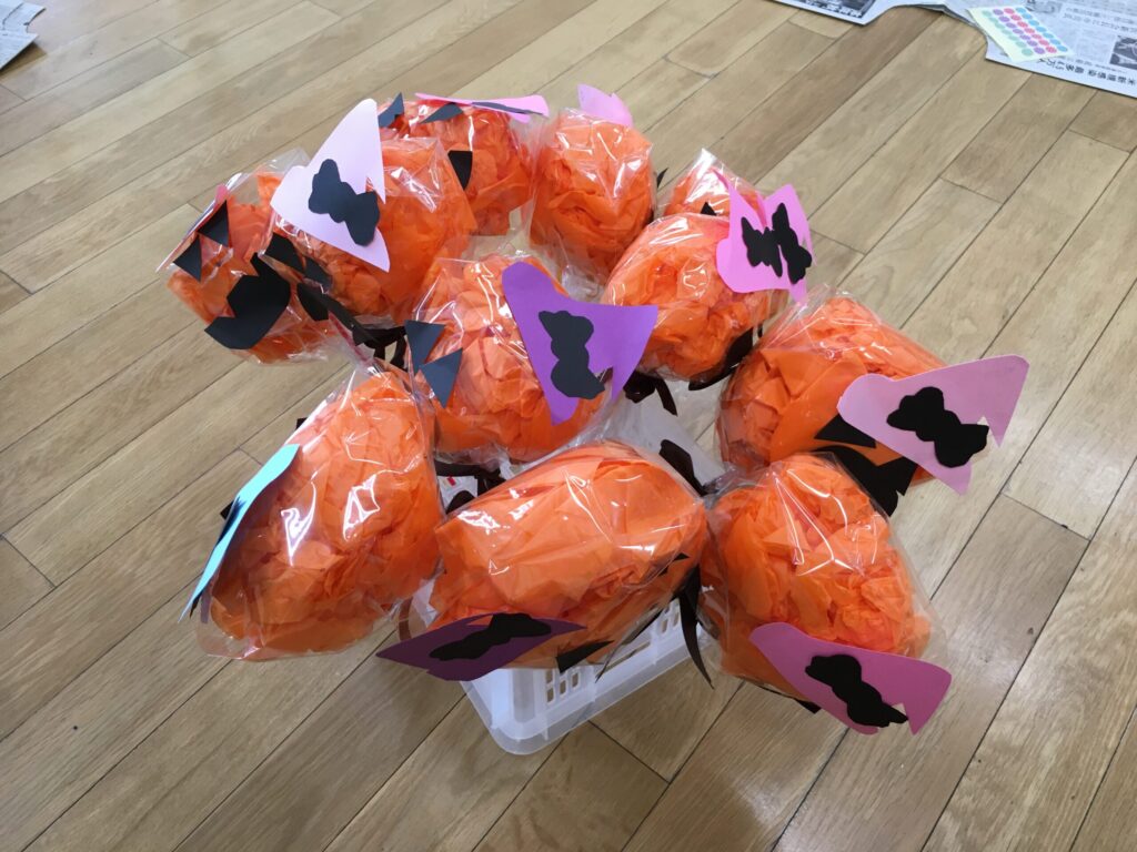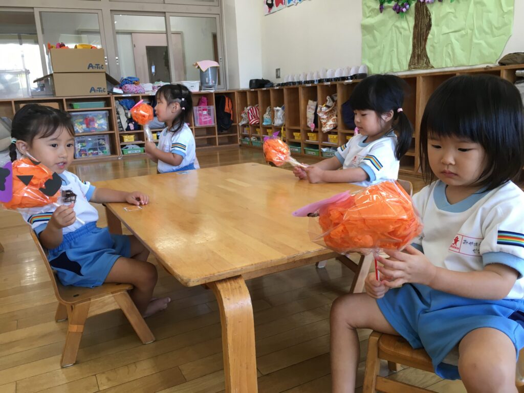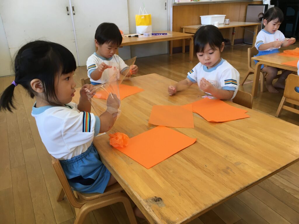 お花紙を優しくまるめ、ビニール袋に入れ、ストローをさしたら先生と一緒にテープを巻いて、最後に顔と帽子を貼り付けました。