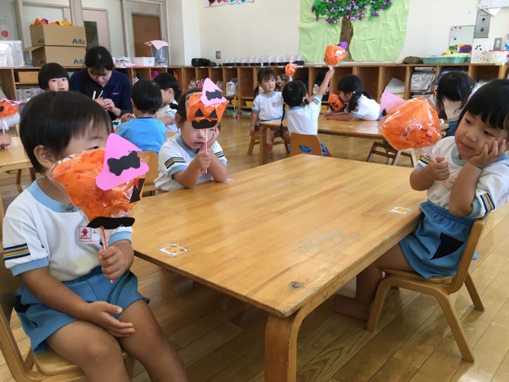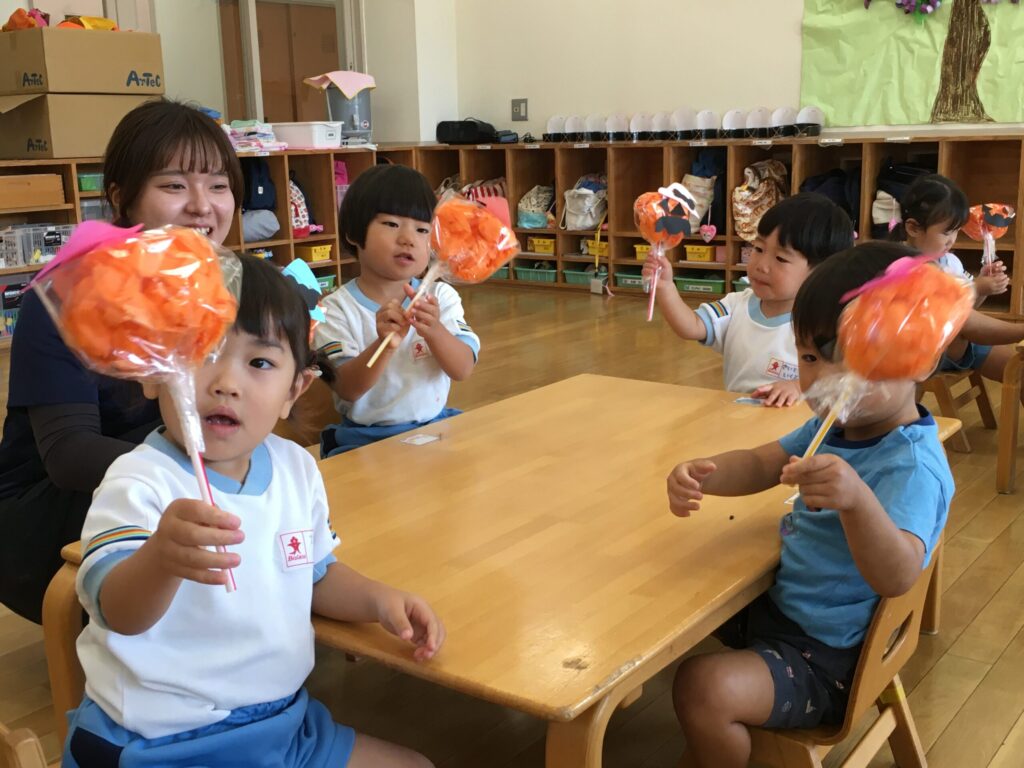 先生が持っているステッキを見て「なあにこれ!」「かぼちゃ!?」と、興味津々の子ども達。