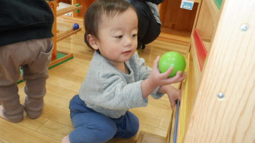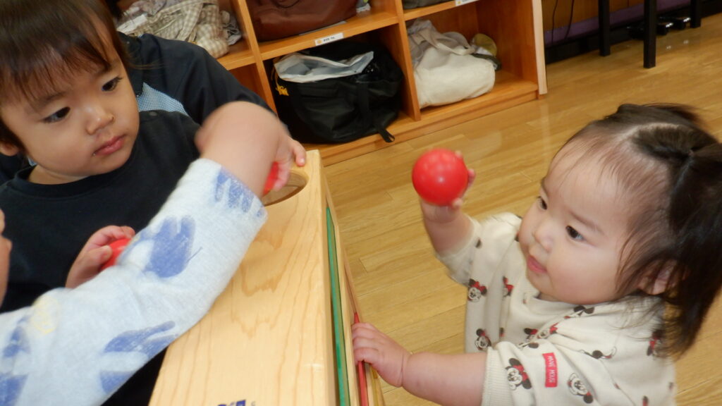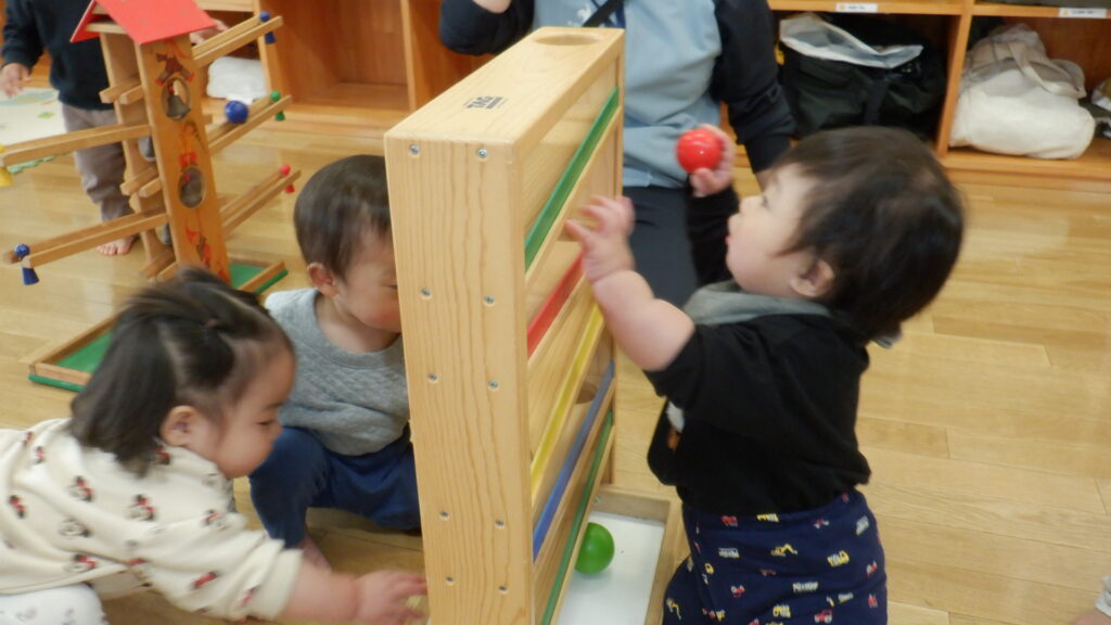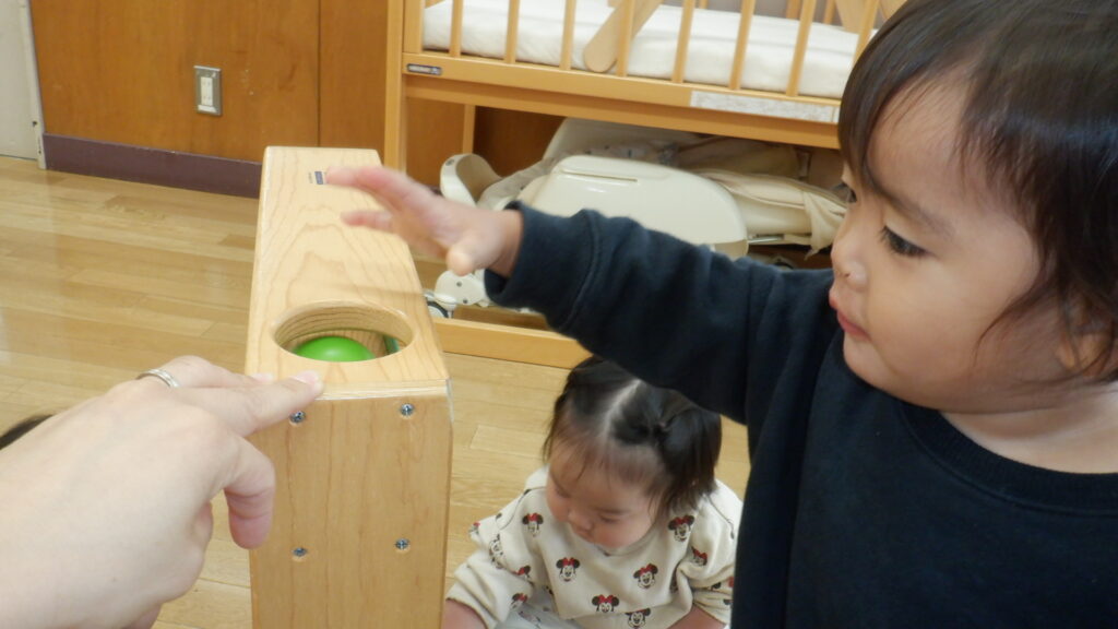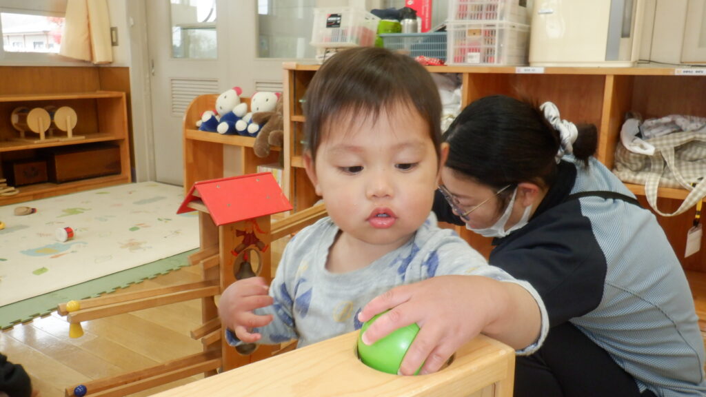 追視のおもちゃで遊びました。追視のおもちゃが大好きなつくし組の子どもたち。穴の中にボールを入れる瞬間、ボールが転がるたびになる鈴、コロコロ転がっていくボールを目で追いかけながら、何度も繰り返して遊んでいました。