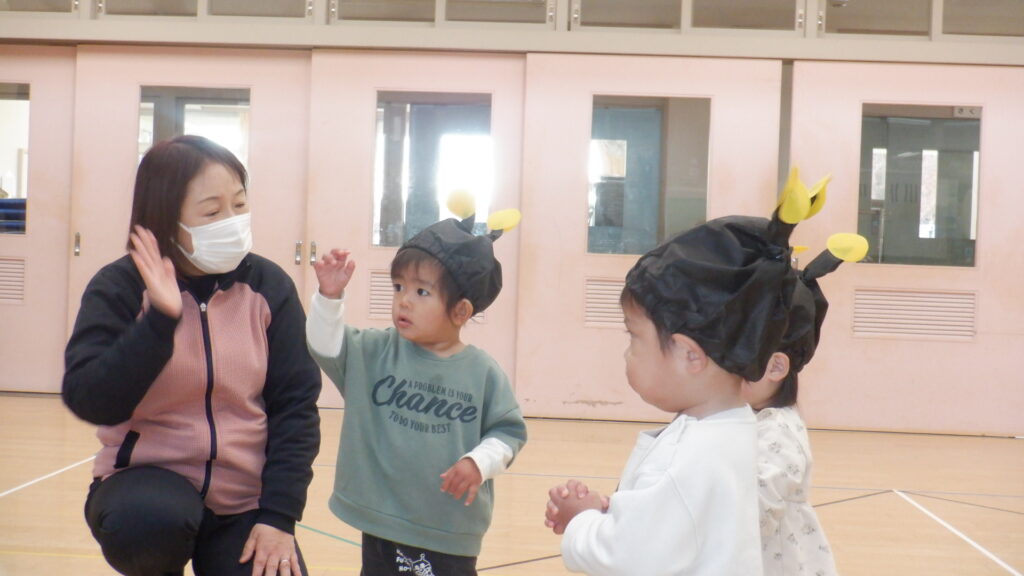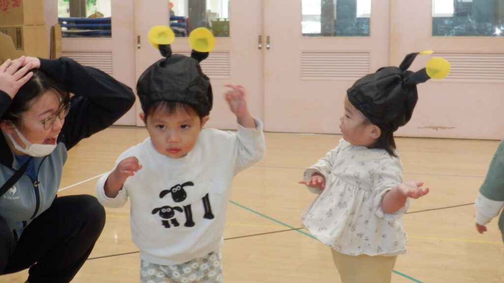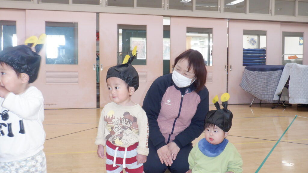 パパとママが作ってくれた帽子を被り、ホールで発表会の練習をしました。最初は帽子を嫌がる子もいましたが、何回かかぶって練習をしたことで、嫌がらずにかぶれるようになった子どもたち。ピアノや歌に合わせて、歩いたりハイハイしたり、パチパチ手を叩いたりと楽しく練習に参加できました。