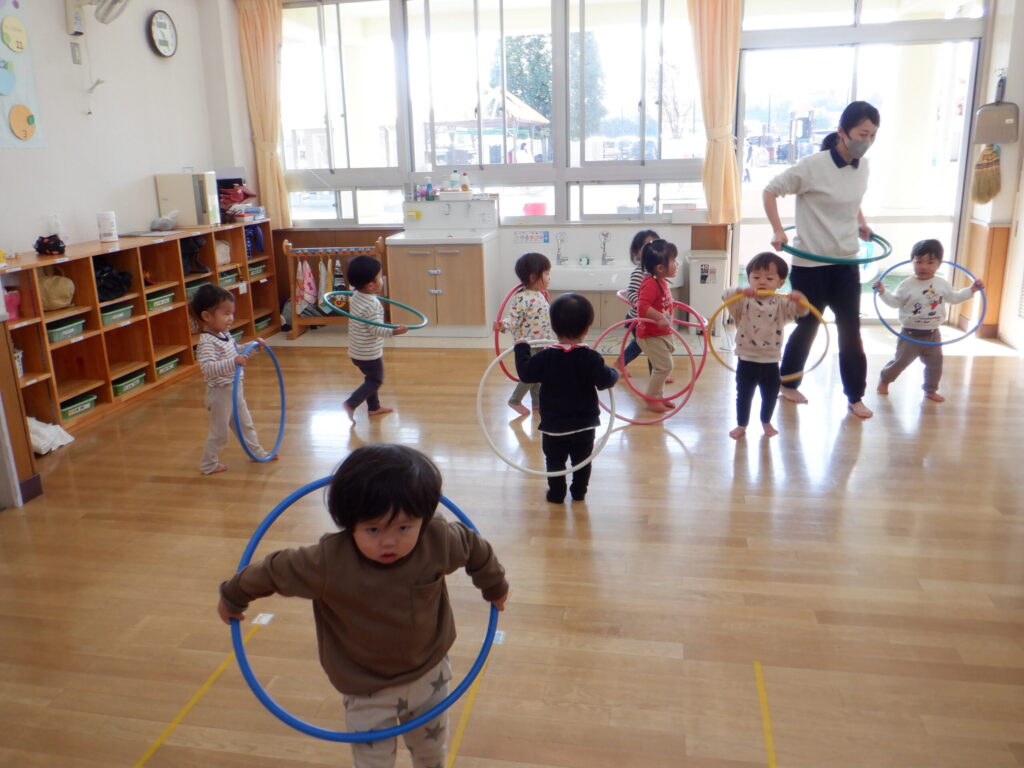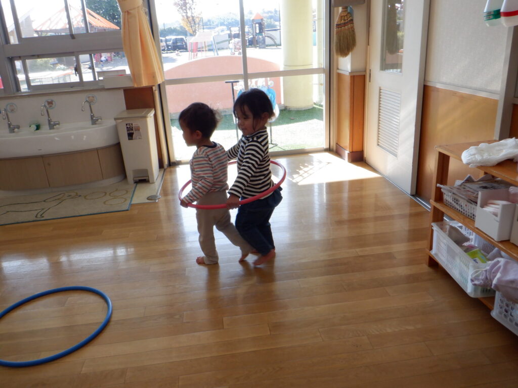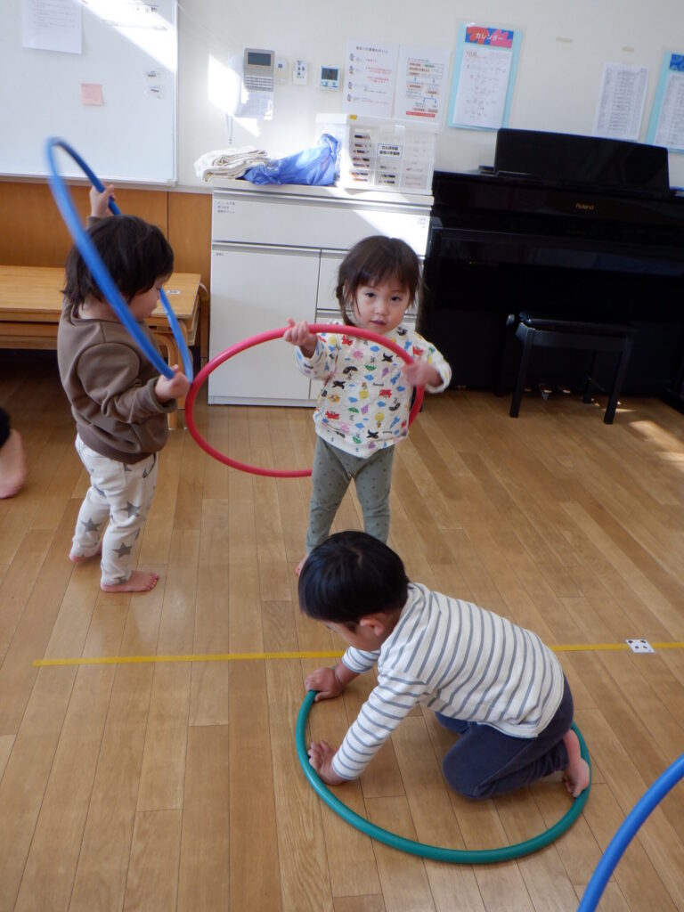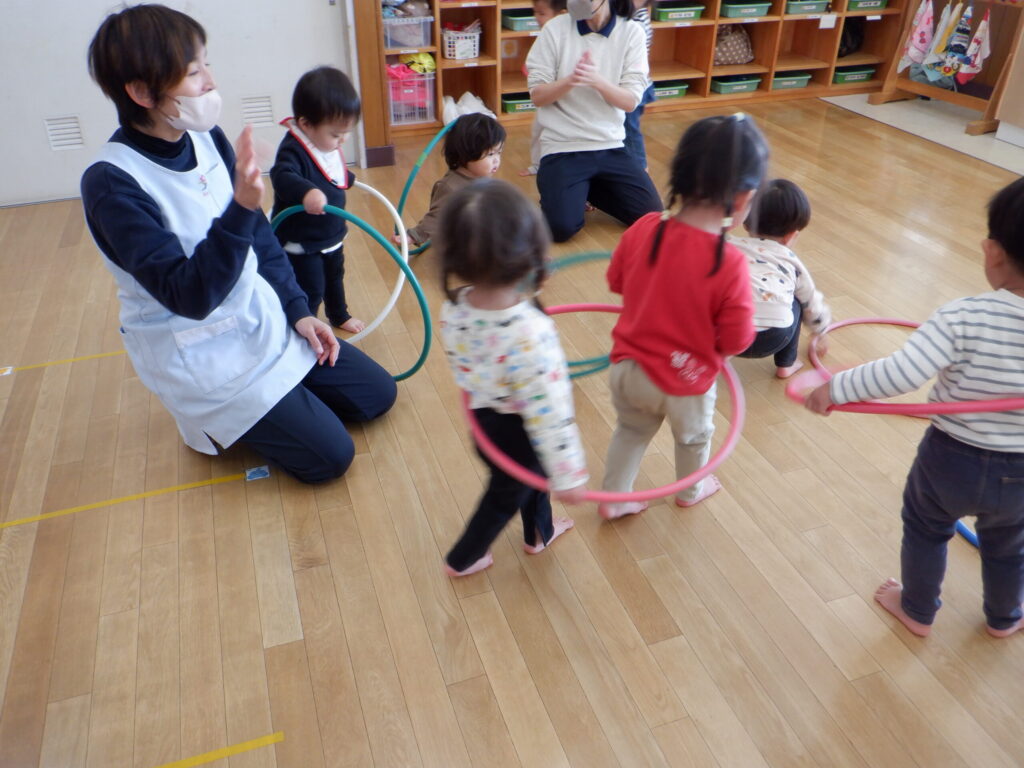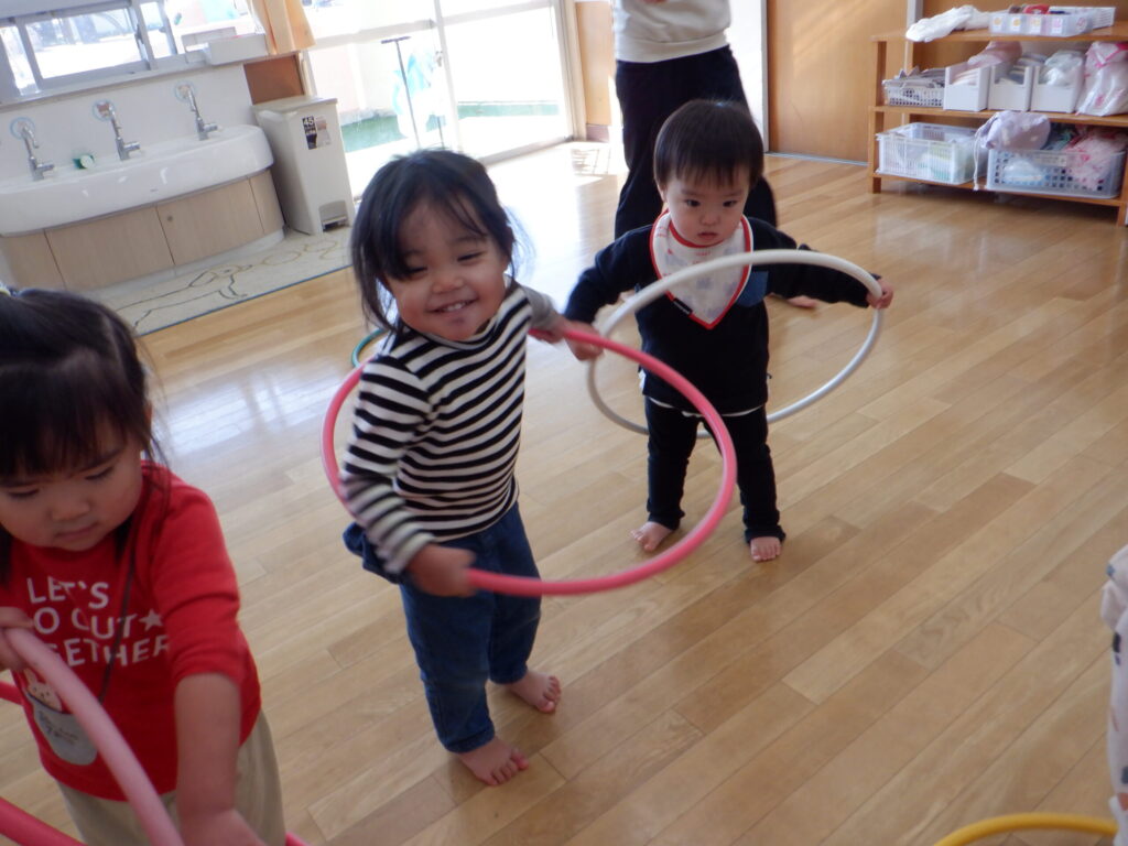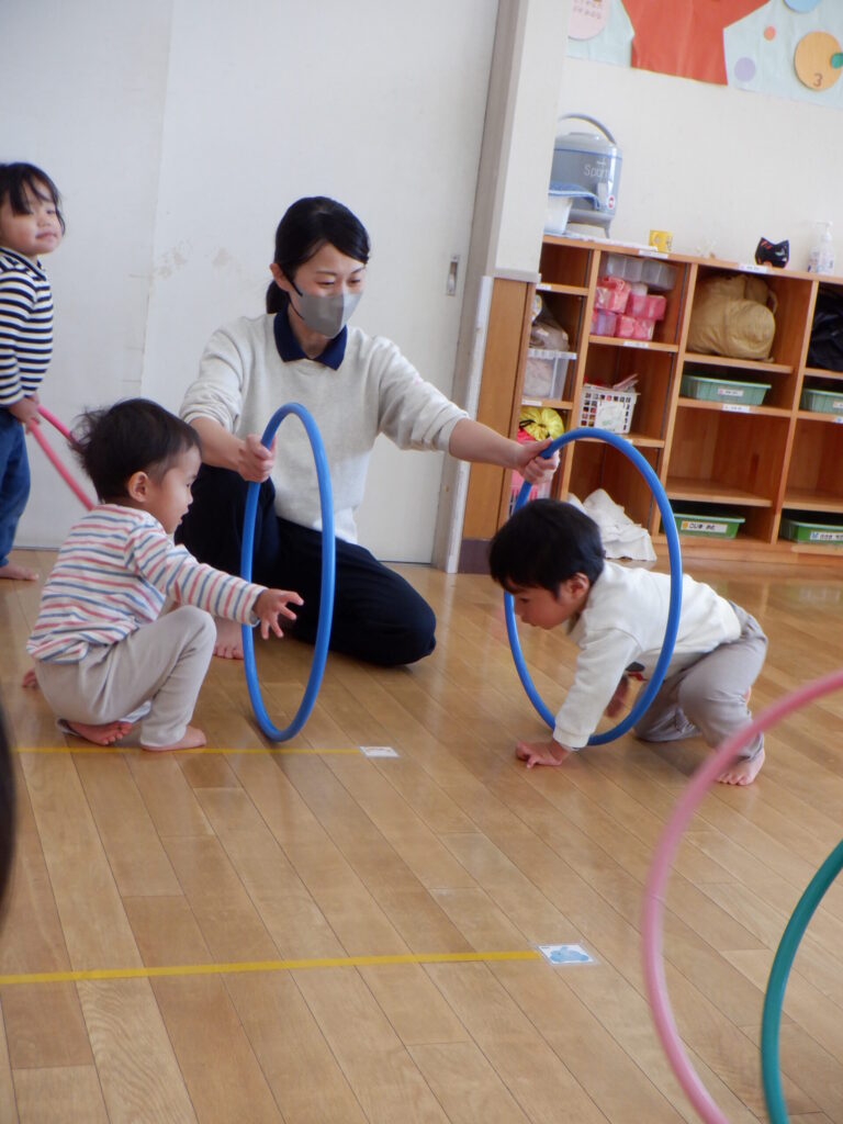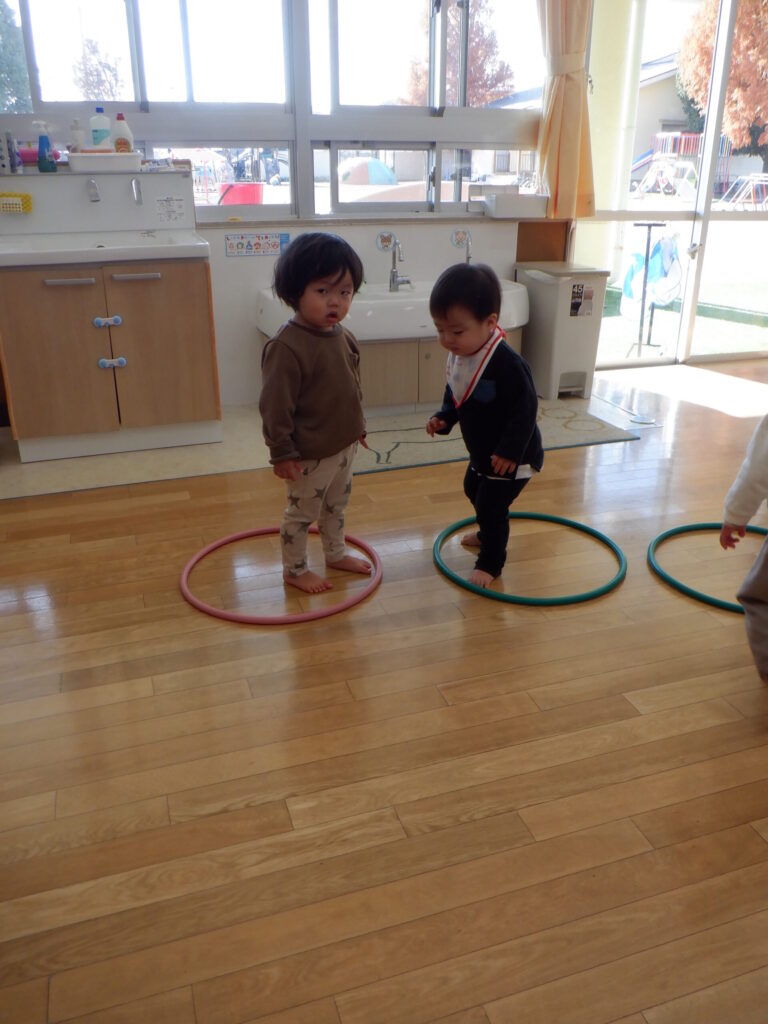 まずはフラフープからフラフープへ移動遊びをしたり、フラフープの中に入ってお散歩もしました!