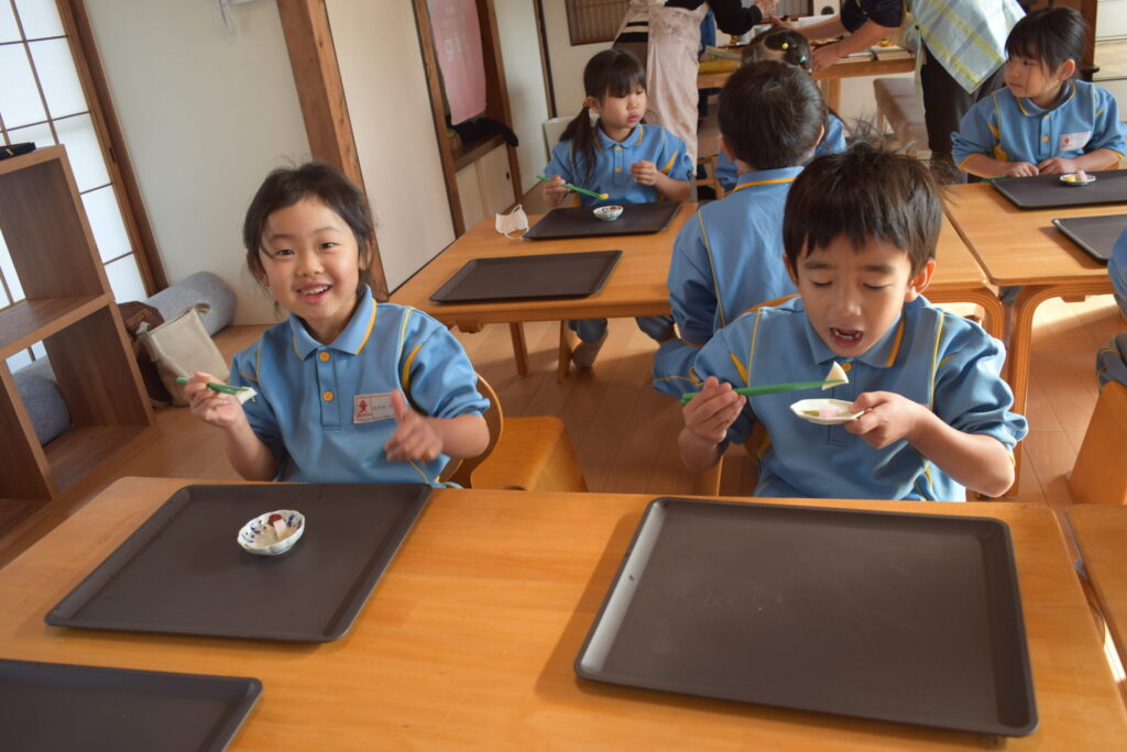 黒豆や数の子・栗きんとん、昆布巻など初めて食べる食材も多かったようで、こどもたちも興味深々でした。なますなど酢の物は苦手なお子さんもいましたが、日本の伝統文化に親しみ、とても良い経験ができました。