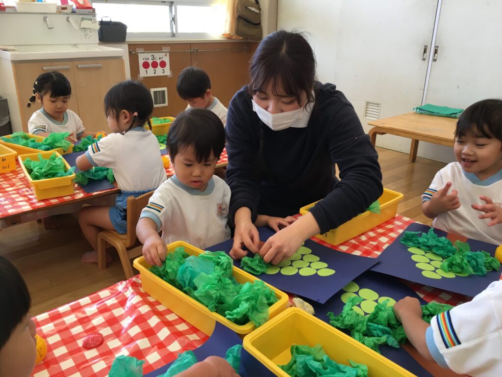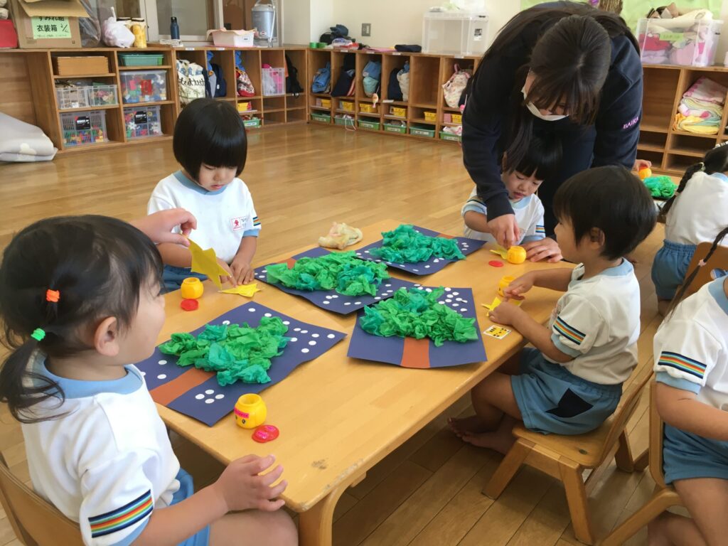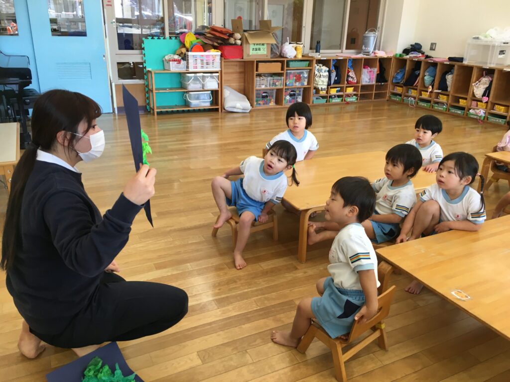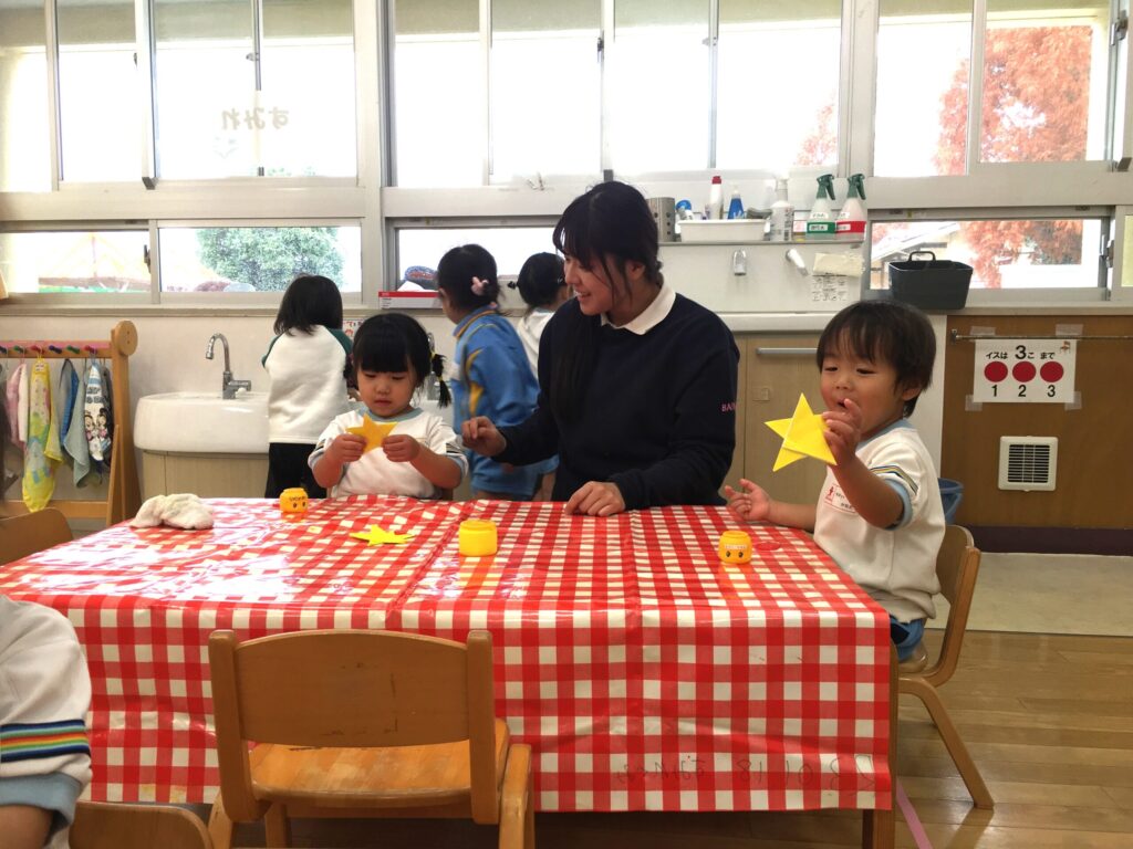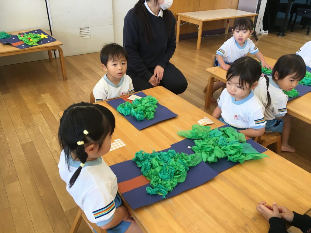 先生が見本を見せながら「これ何か知ってる~?」と聞くと、「クリスマスのやつ!」「サンタさんの木!!」「クリスマスツリーだよね!!」と思い思いに知っていることをたくさんお話してくれました。