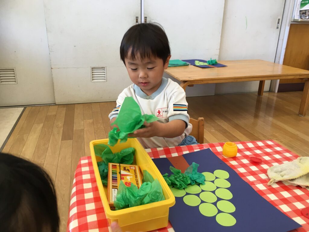 お花紙をくしゅくしゅ丸め、丸い画用紙の真ん中にのりをつけて貼り付けました。