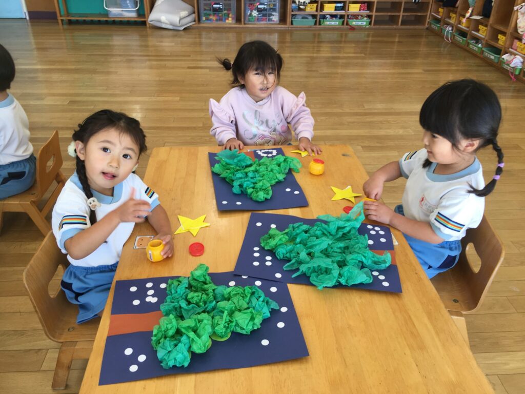 木ができたあとには、星や雪、ポンポンを貼り付けて、とっても可愛い世界に1つだけのクリスマスツリーができました。