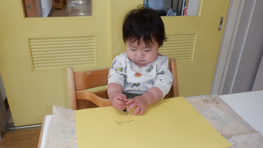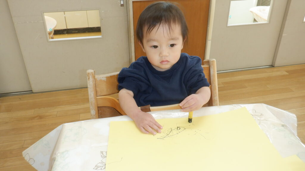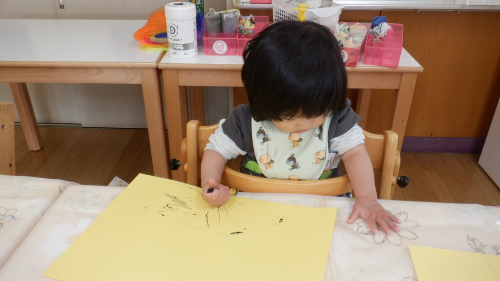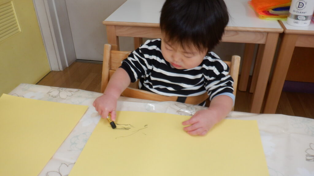 鬼のお面製作で黄色い画用紙に黒いクレヨンでなぐりがきをしました。ギザギザや点々をたくさん描けました。少しずつ力もついてきていて、以前よりも濃い線が描けるようになってきました。
