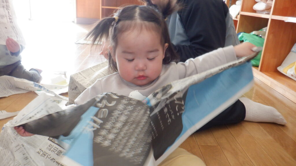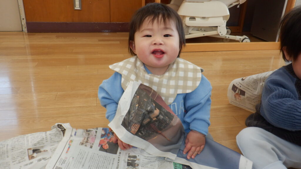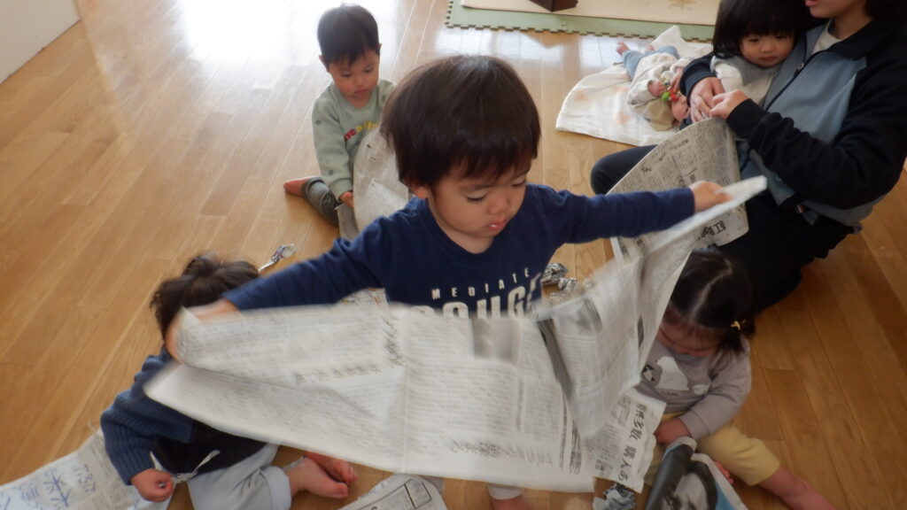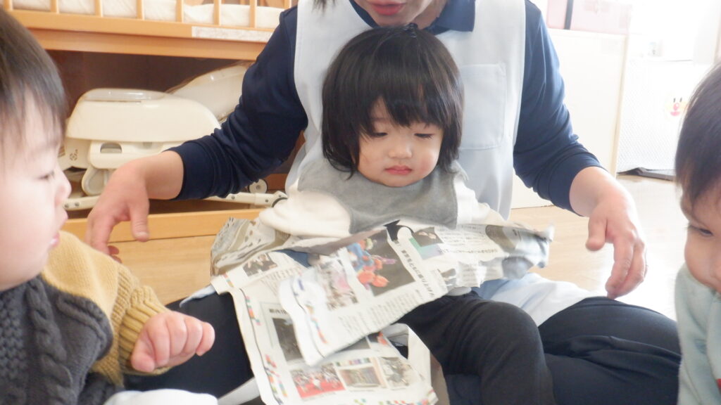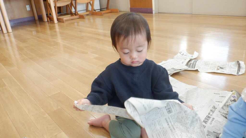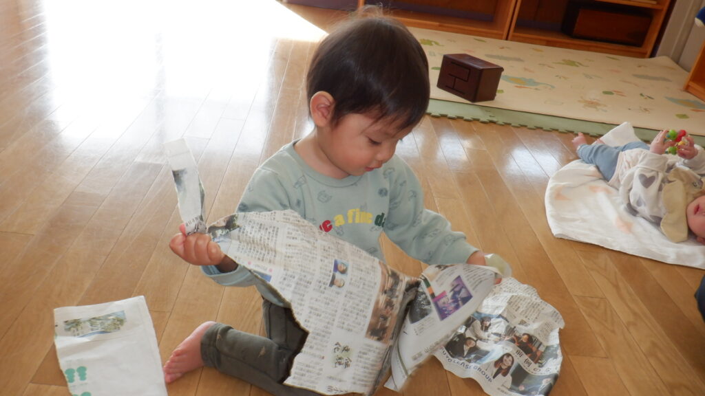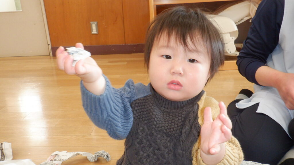 新聞紙で遊びました。少し切込みを入れて渡すと、両腕をたくさん広げてビリビリと破くことができました。細かくちぎった新聞紙を上から降らせたり、グシャグシャに丸めて豆まき用の豆を作ったりして遊びました。
