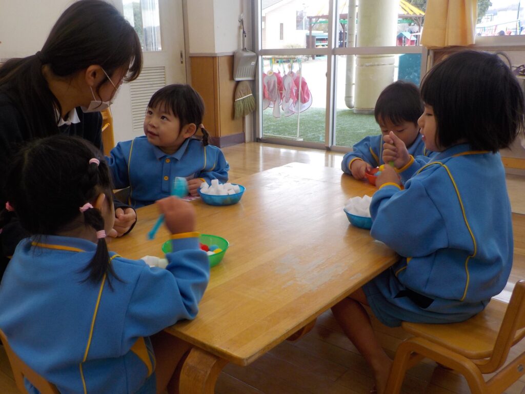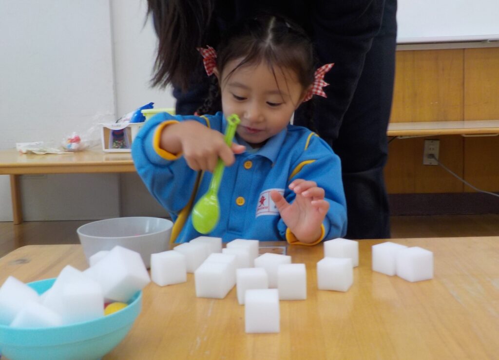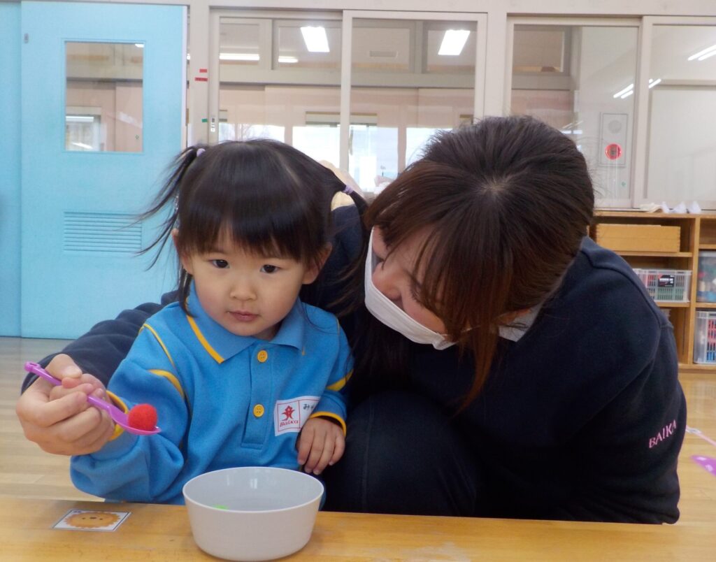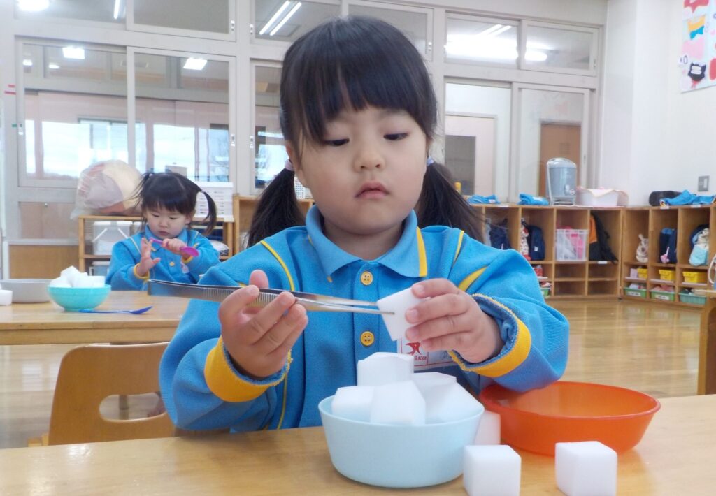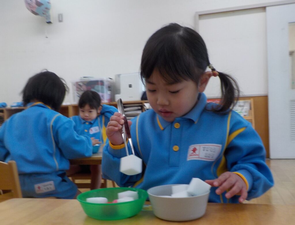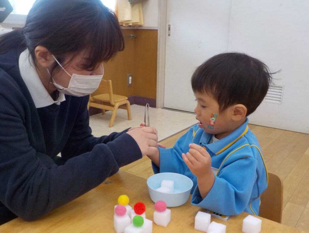 ピンセットを使って、おはし遊びにも挑戦しました。先生に持ち方を教えてもらうと、とっても手元に集中して真剣に取り組んでいました。