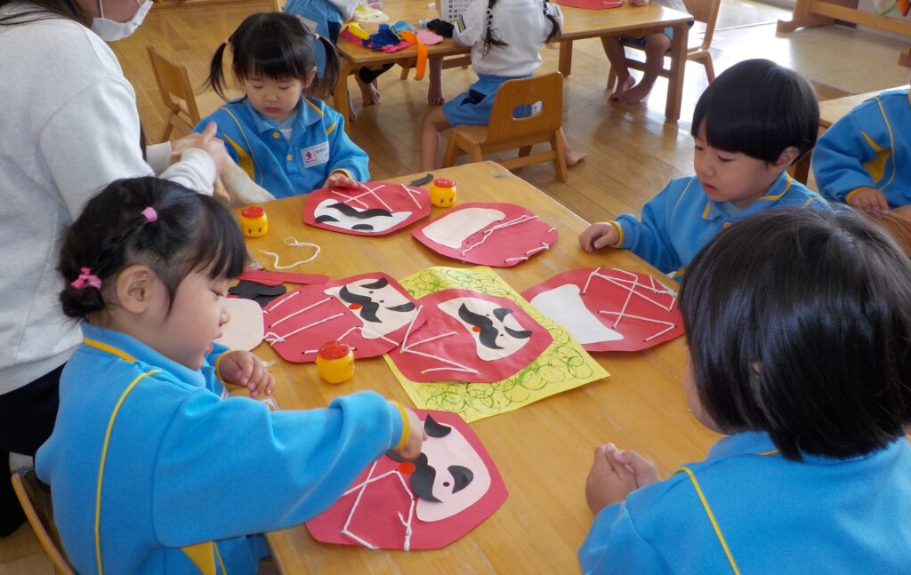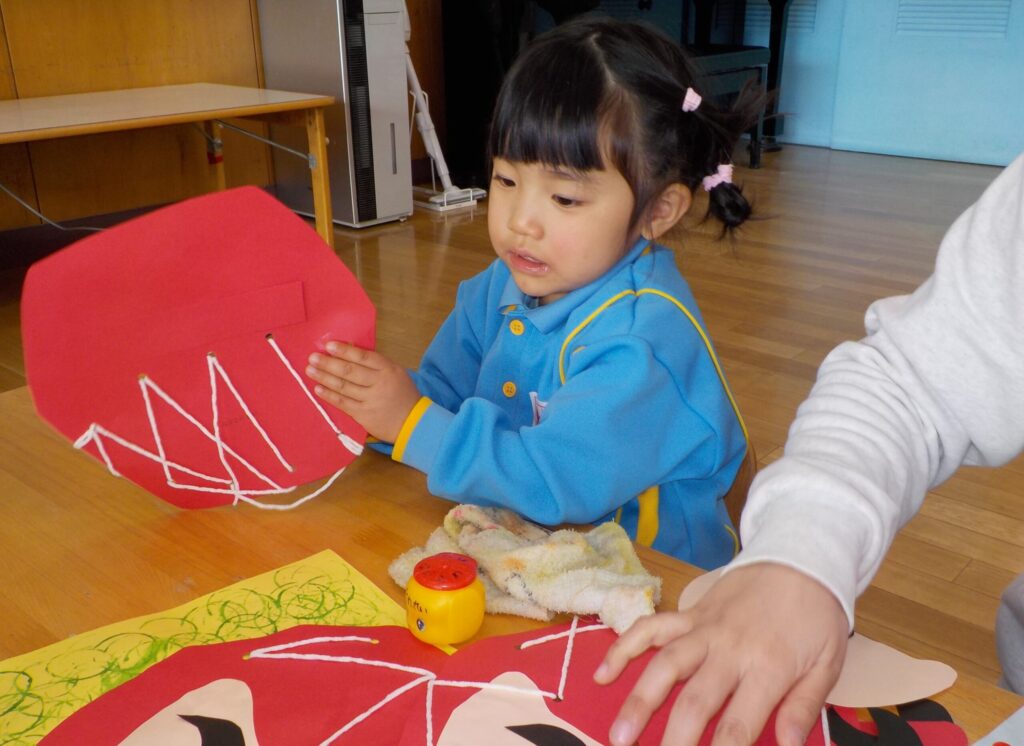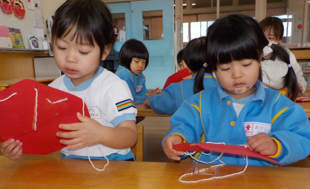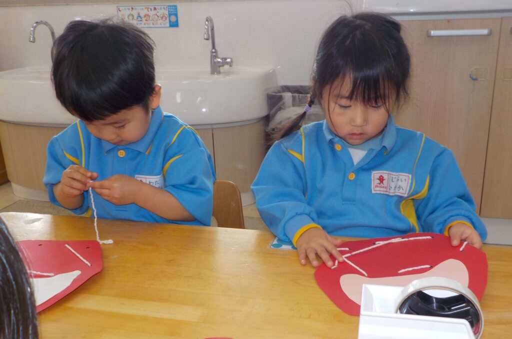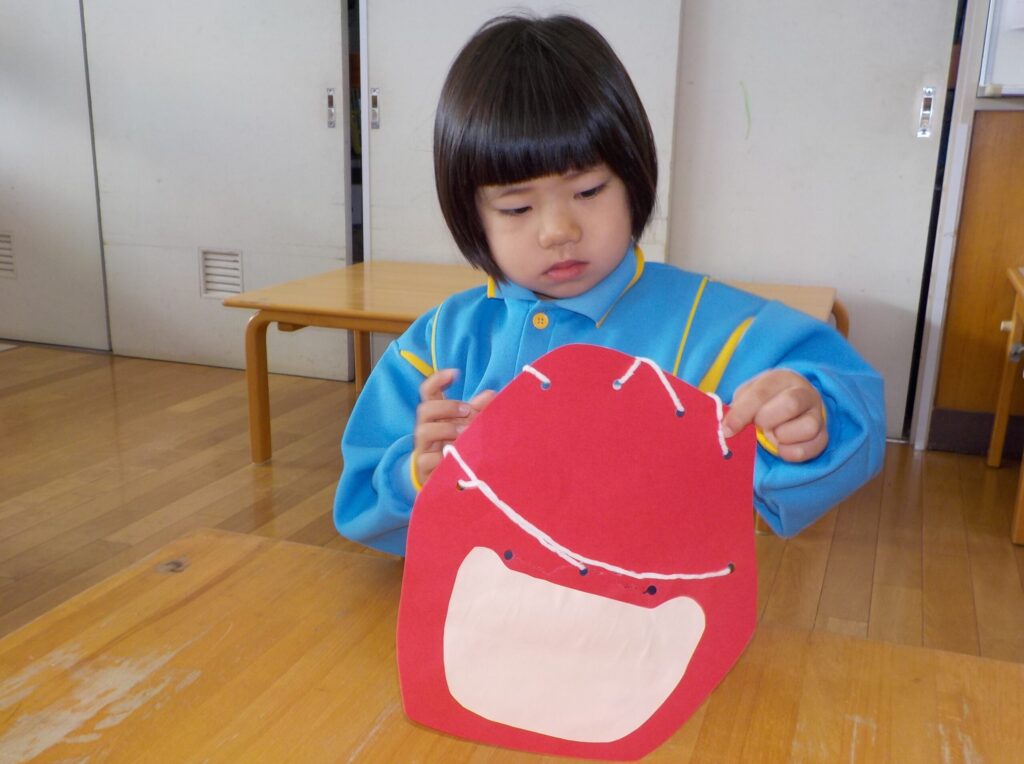 紐通しに苦戦する子ども達でしたが、全て通すことができると「できた!」と達成感に満ちた表情を浮かべていました。