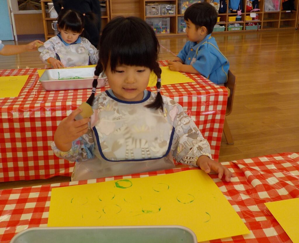 だるまの背景は、トイレットペーパーの芯で、緑の絵の具をつけてスタンプをしました😊