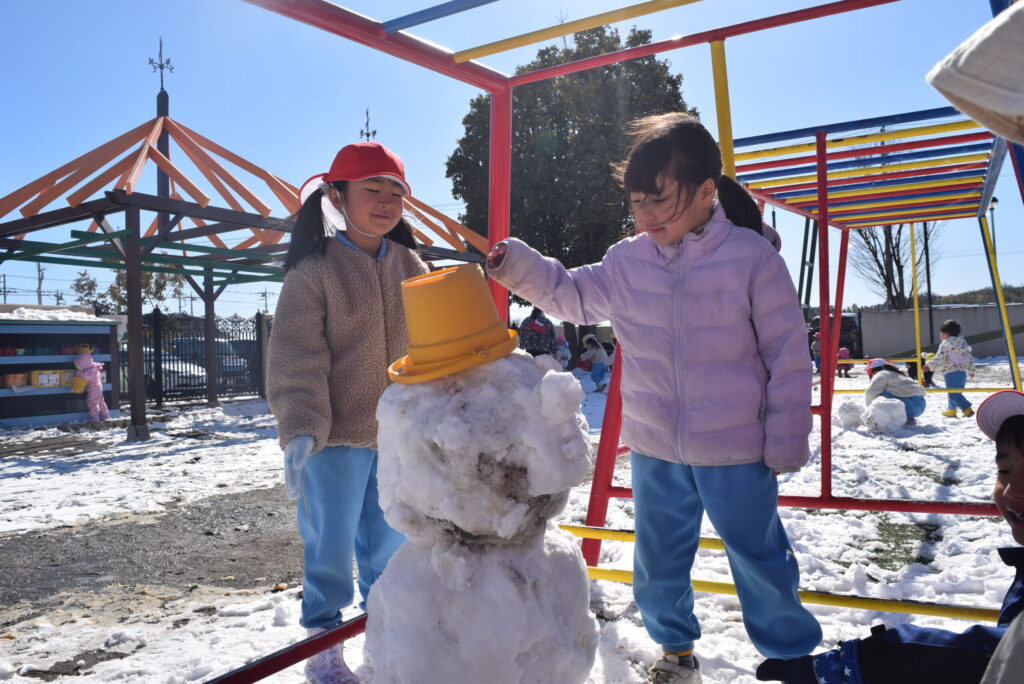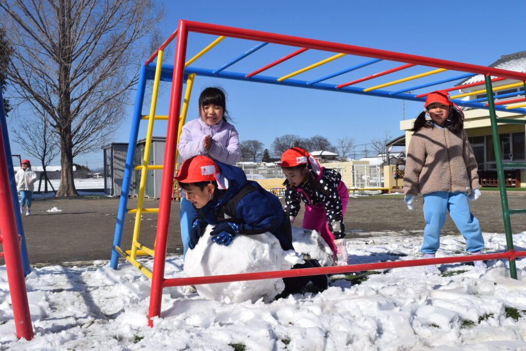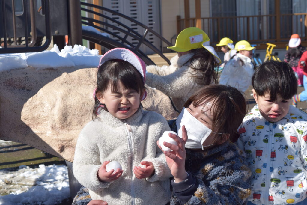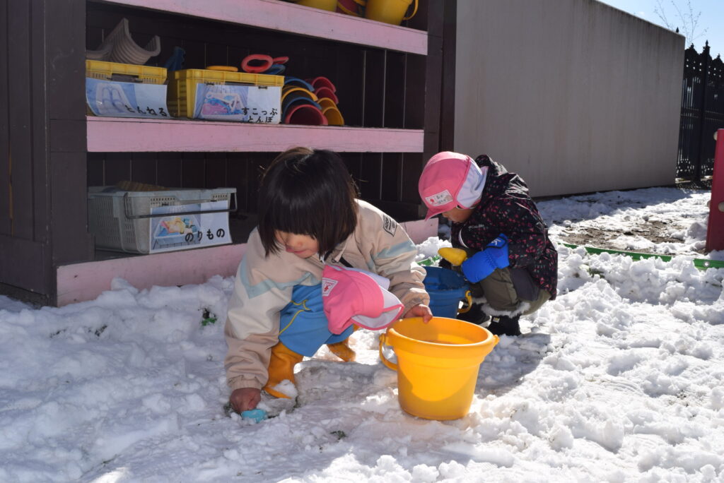 「つめた~い」「きゃ~」と楽しそうに雪遊びをするこどもたちの声が園庭に響き渡っていました