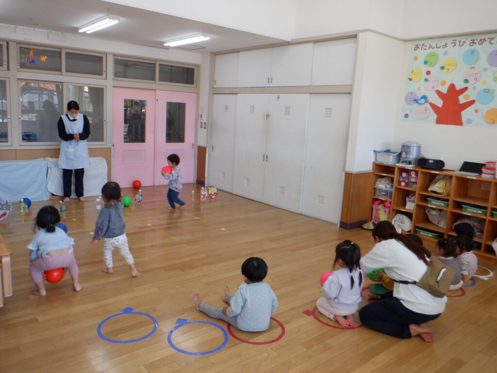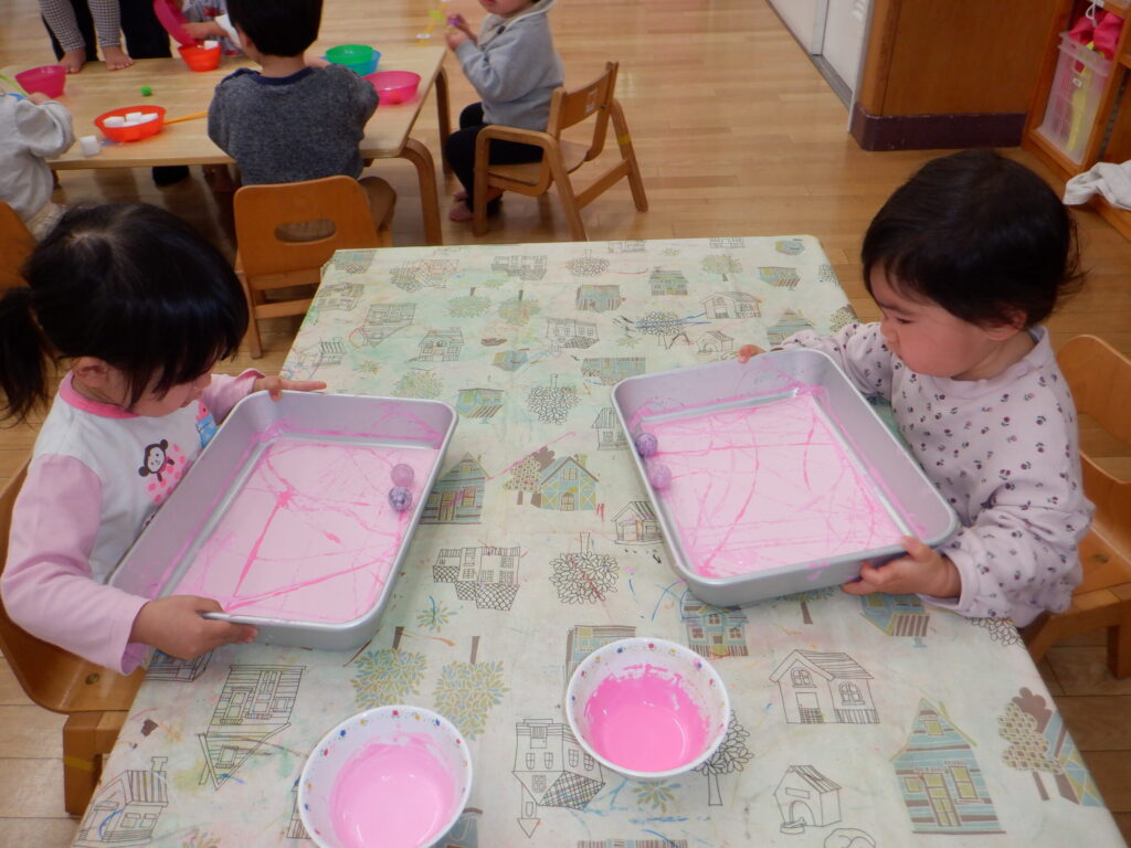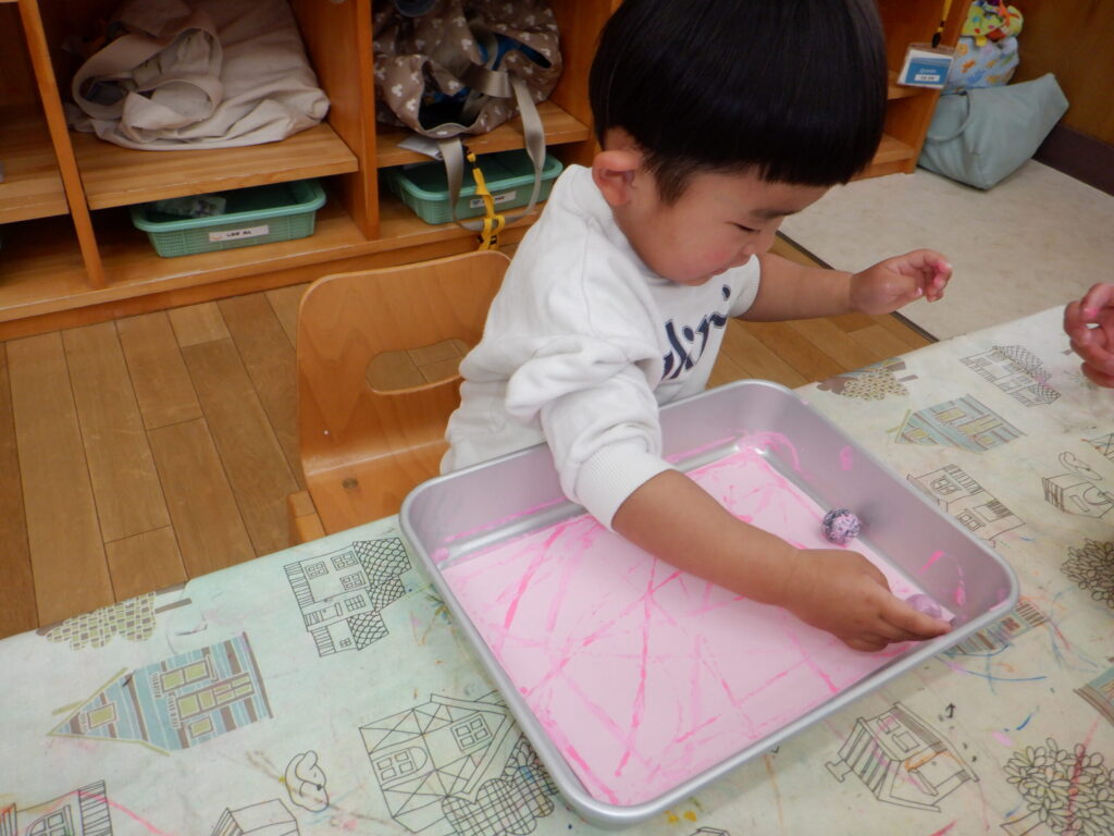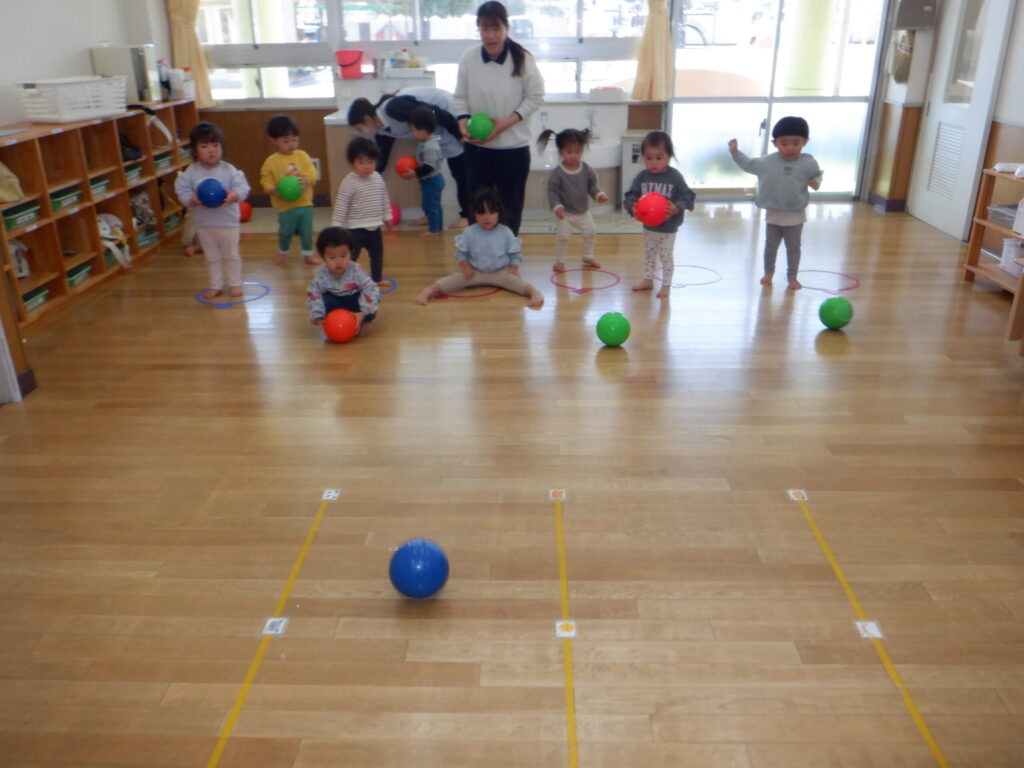 バットを両手で持ってビー玉がコロコロ転がる様子を真剣に見ているたんぽぽ組さんでした!!