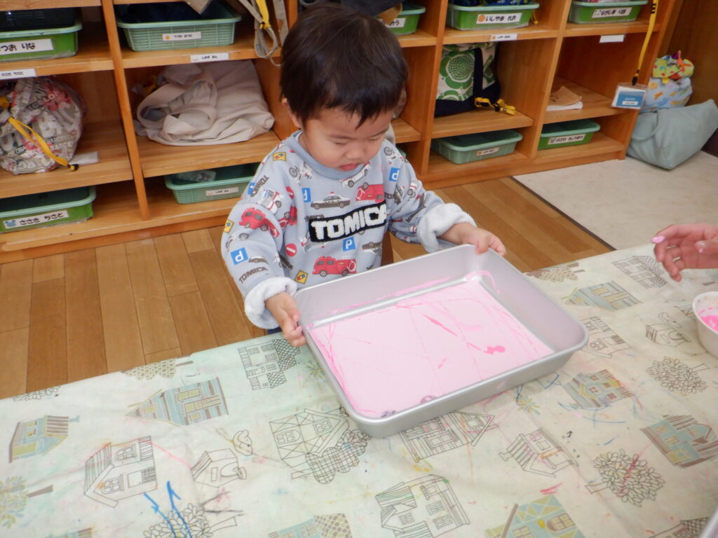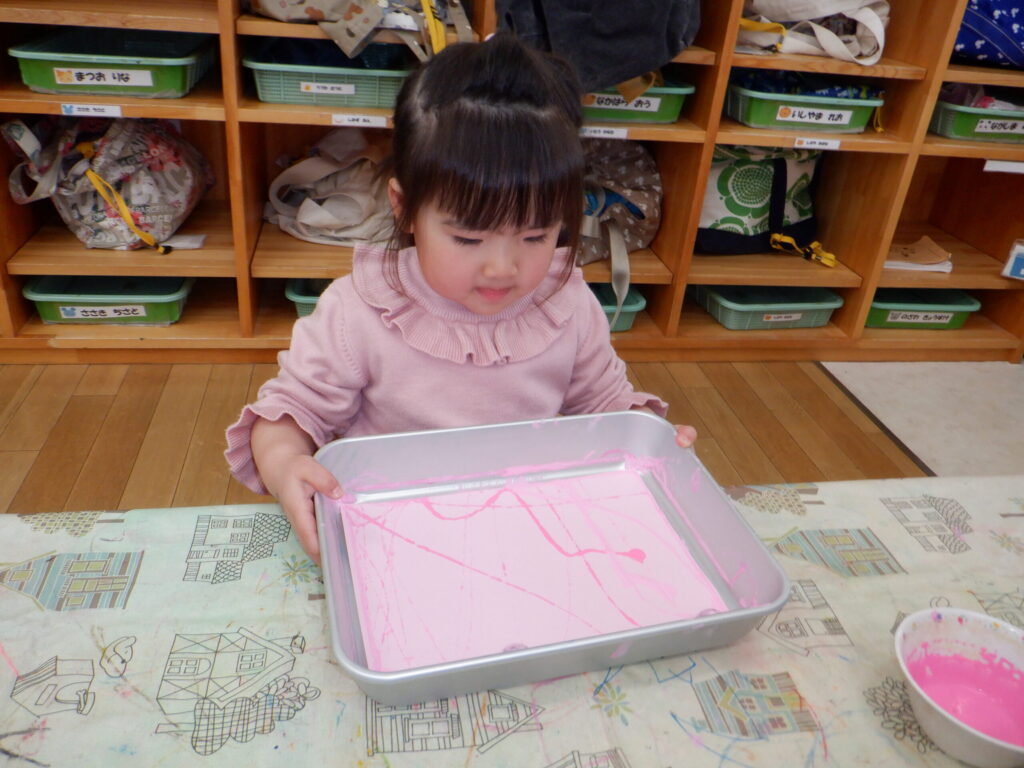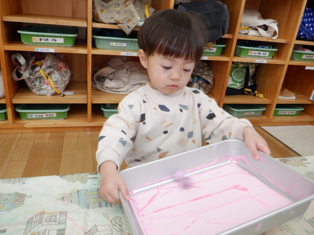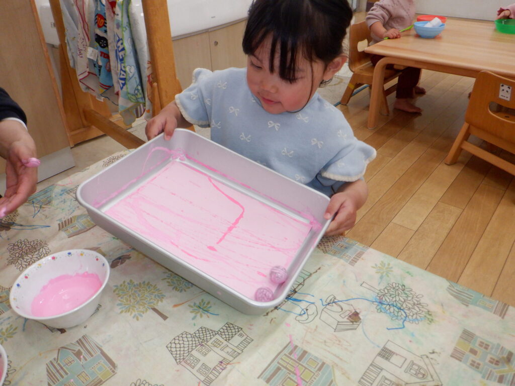 バットを両手で持ってビー玉がコロコロ転がる様子を真剣に見ているたんぽぽ組さんでした!!