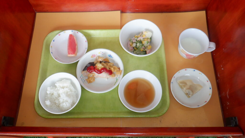 ◎今日はコーンフレークをかけて焼いた、さけのコーン焼きです。