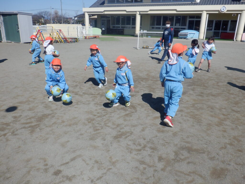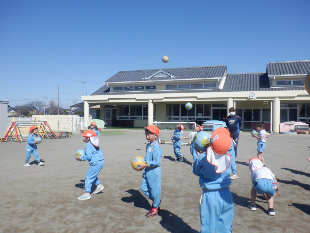 まず始めにボールにたくさん触れ、ボールをたかく上に投げて手をパチンと叩いてキャッチをしました!出来ると、「できたよ!」と嬉しそうな子どもたち。