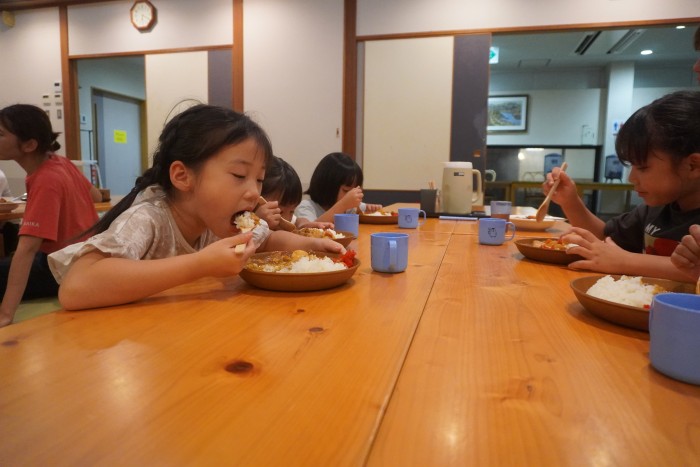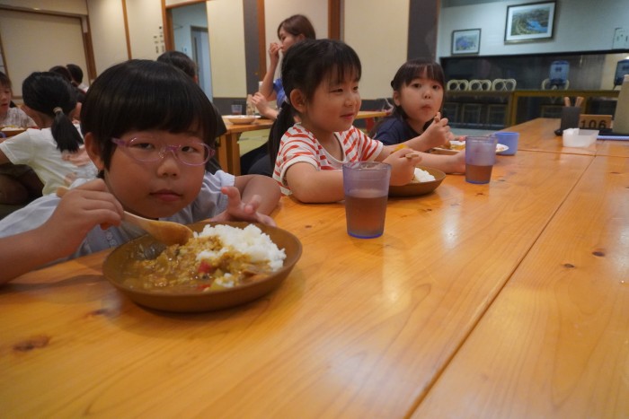 宿舎に戻った後は、お風呂に入って室内遊びをした後、夕食のおいしいカレーを食べました。