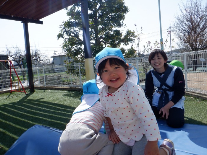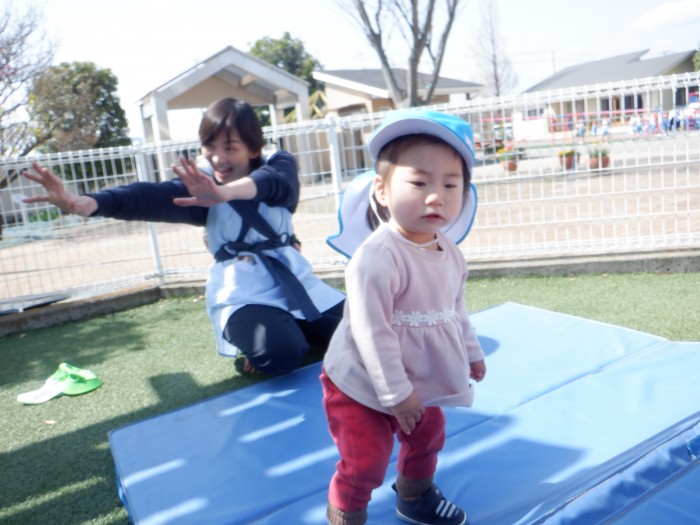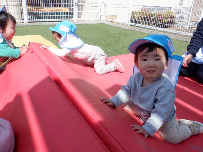 朝は芝生の庭に出てマラソンをしてマット遊びをしています。マットのお山が大好きでお山にすると、みんな集まってきてマットのお山に挑戦していました。朝から元気いっぱいのたんぽぽ組さんです。