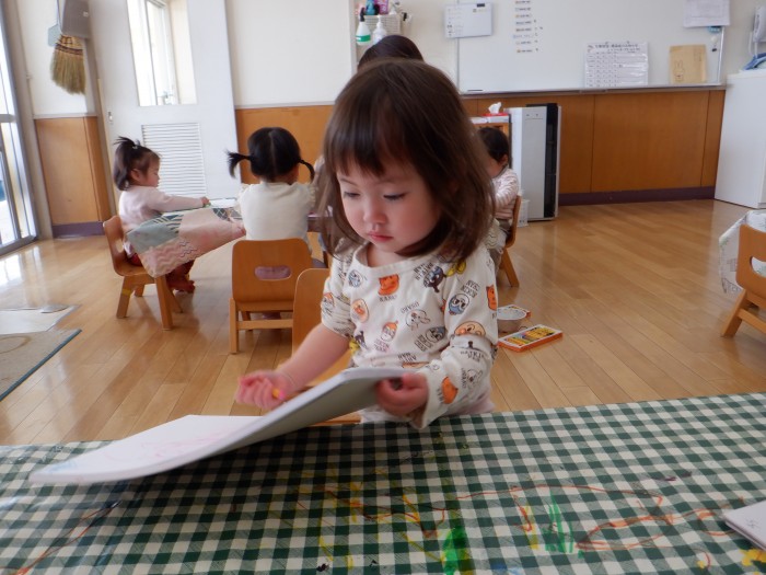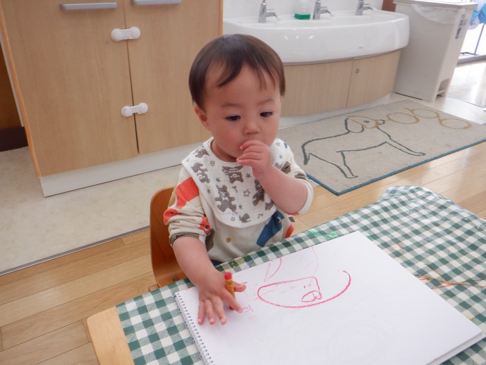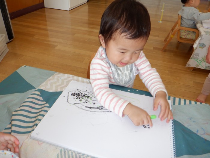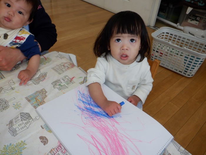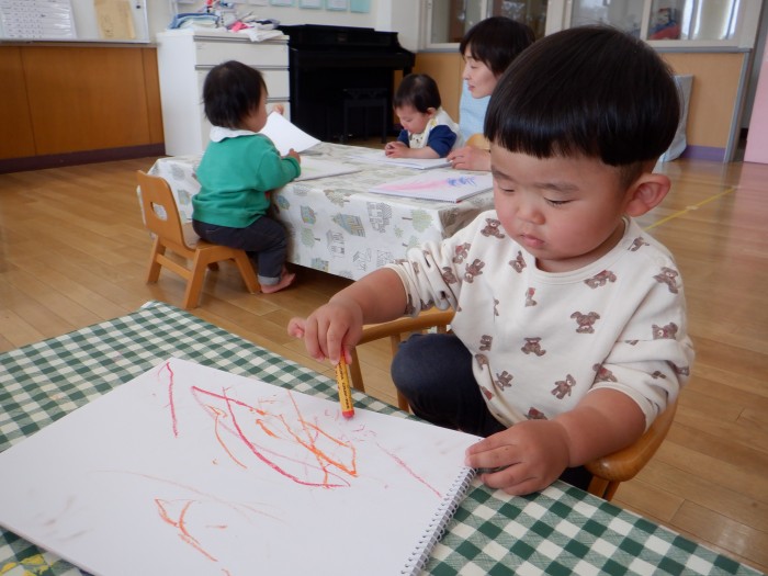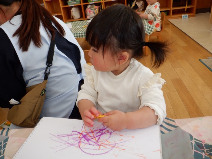 なぐり描きでは自分の好きな色を選んで「ぐるぐるだよ」と先生が言うと白い画用紙にたくさん描いていました。