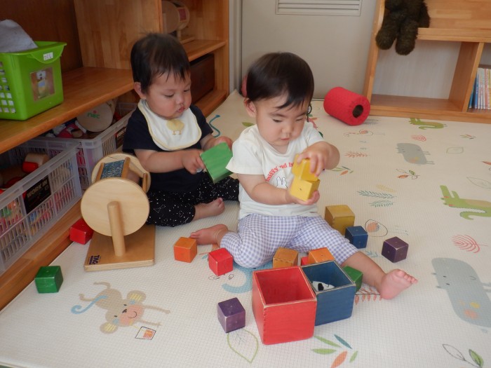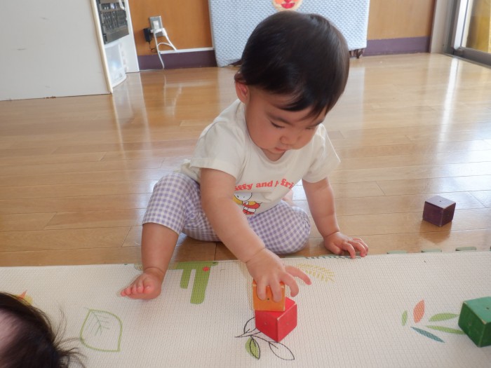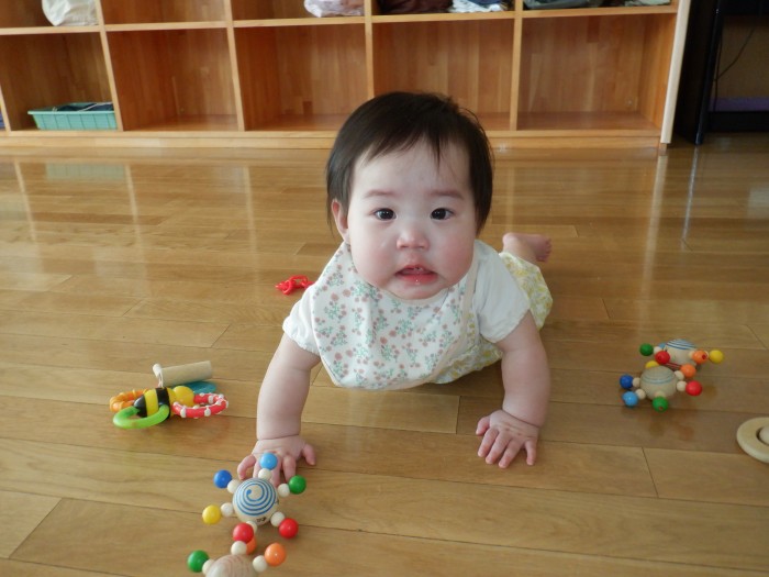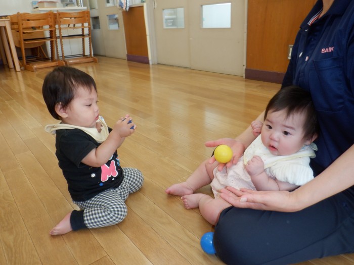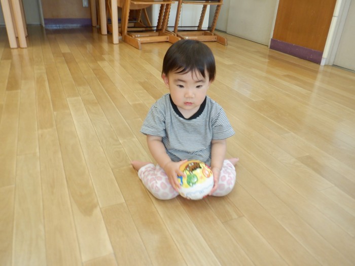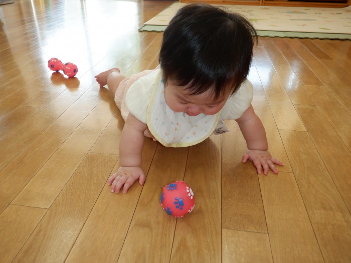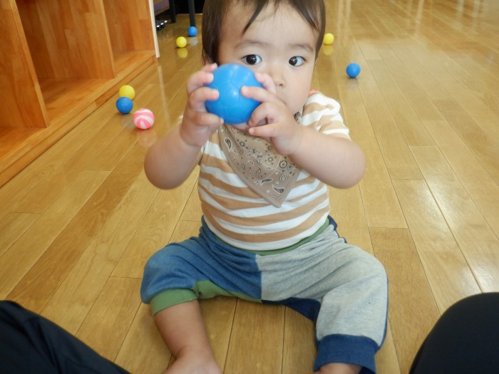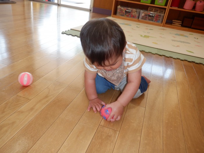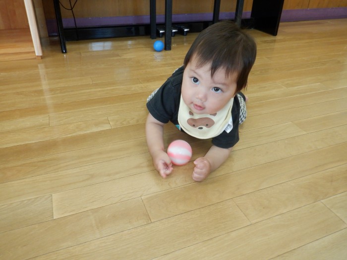 ボール遊びをしました。転がるボールを、まてまて〜とハイハイで追いかけたり、手で握ったり、口で確かめたりして遊びました。表面が少しボコボコしているボールも、嫌がらずに触っていました。