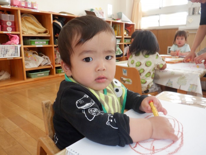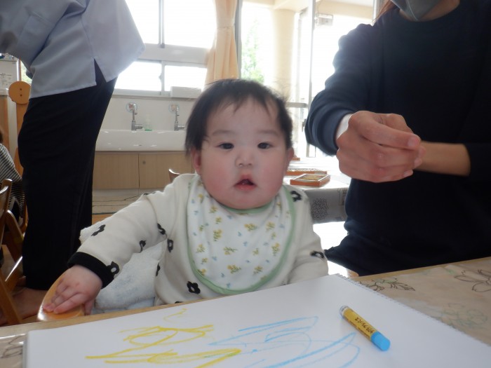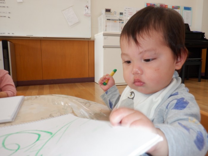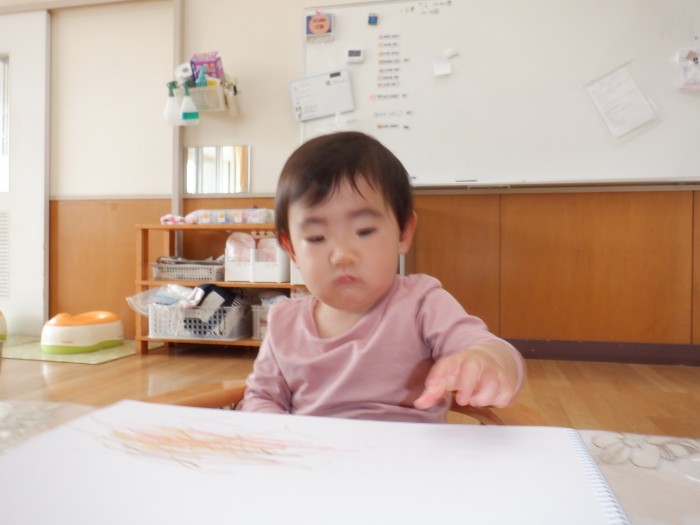 自由画帳にクレヨンでなぐりがきをしました。クレヨンをしっかり握って、先生と一緒にギザギザや丸をたくさん描きました。