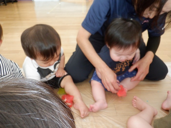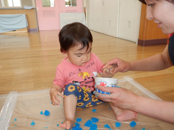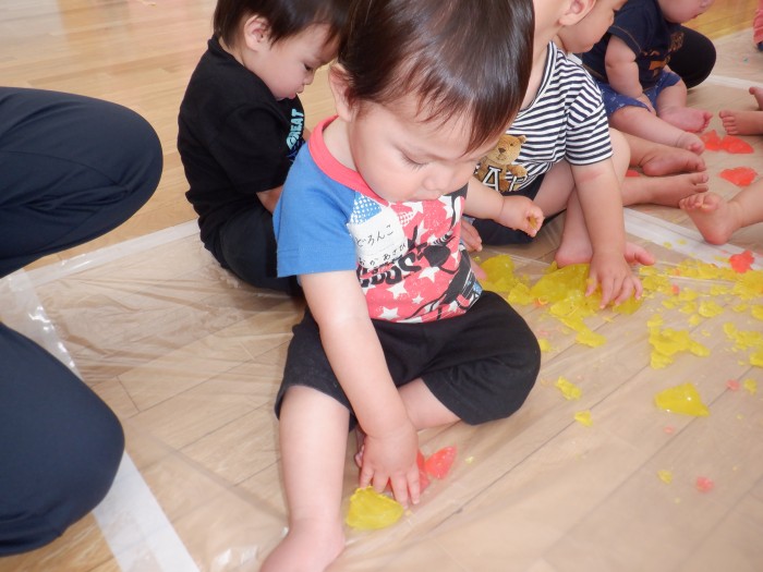 たんぽぽ組と一緒に寒天ゼリーで遊びました。初めての寒天ゼリーに最初は戸惑っていた子どもたちも、せんせいと一緒に触ったり握ったりするうちに慣れていき、たくさん遊ぶことができました。