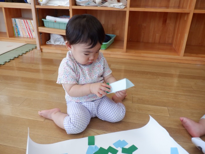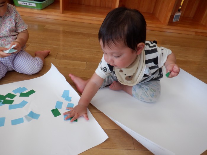 シール貼りをしました。シールが剥がしやすいように台紙を少し折って渡すと、一生懸命つまんでシールを剥がしたり貼ったりを楽しんでいました。