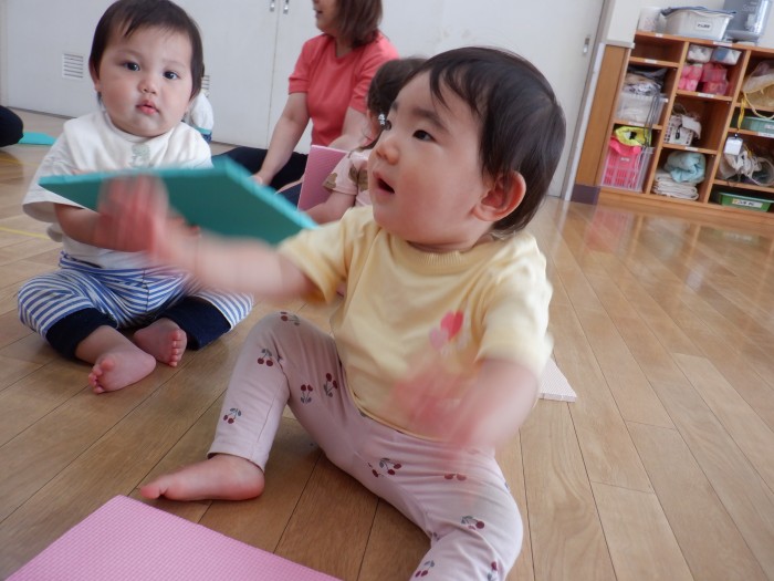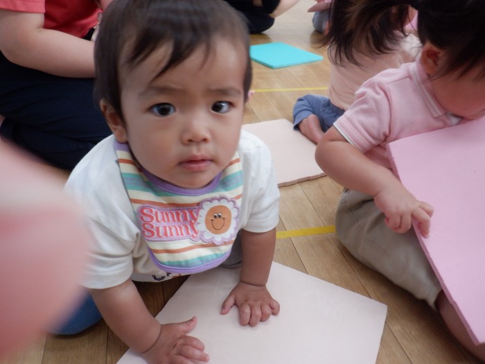 毎週木曜日はリトミックがあります。今月はカラーボードを使って遊びました。「おおきなたいこ」の歌に合わせて大きく叩いたり、小さく叩いたりして楽しく参加しています。