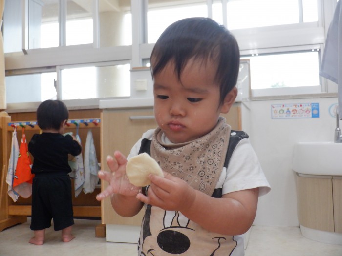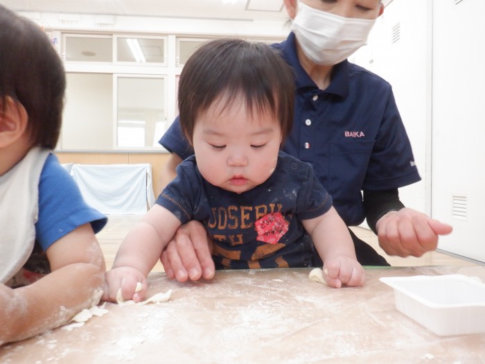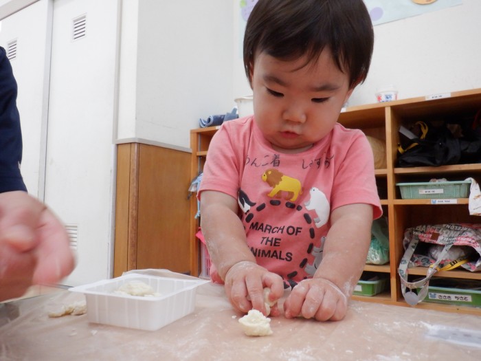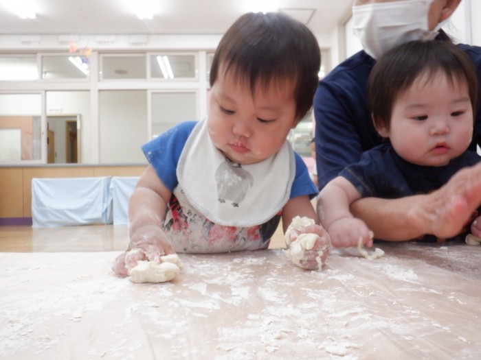 金曜日にはたんぽぽ組と一緒に小麦粉粘土をして遊びました。最初は戸惑っていた子もいましたが、遊んでいくうちに慣れていき、握ったりちぎったりしてたくさん遊びました。