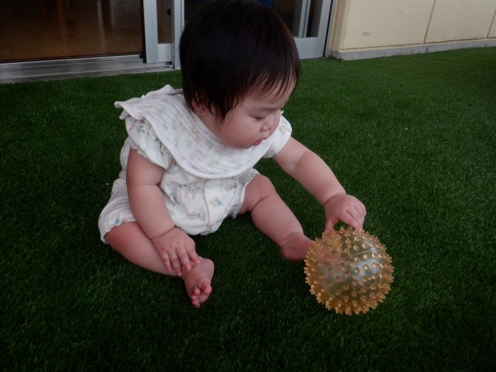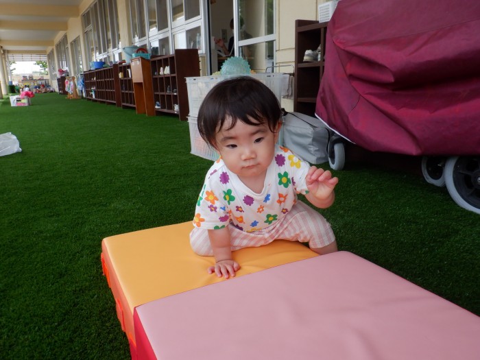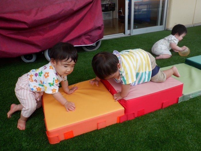 雨が降っていたのでテラスで遊びました。テラスが人工芝になり、雨でも外で遊べるようになって、嬉しそうなつくし組のお友達です。
