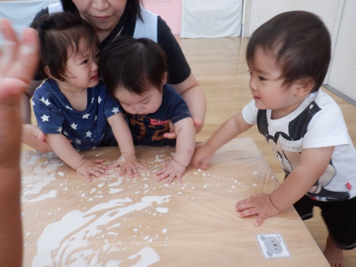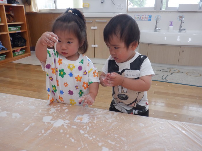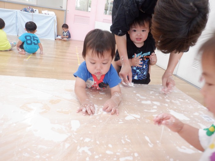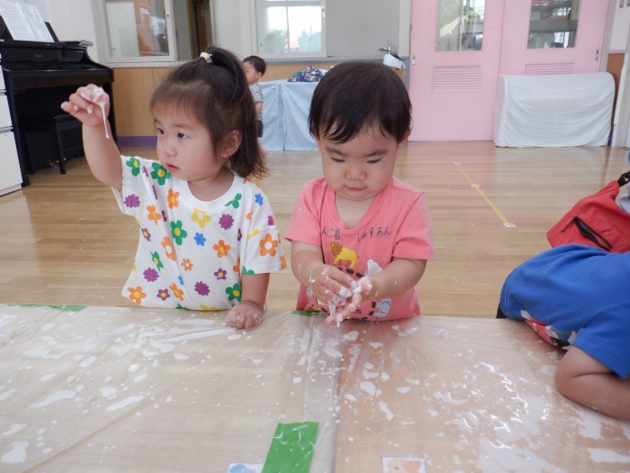 片栗粉粘土で遊びました。トロトロの感触に、最初は涙が見られるお友達もいましたが、先生と一緒に触って遊べました。