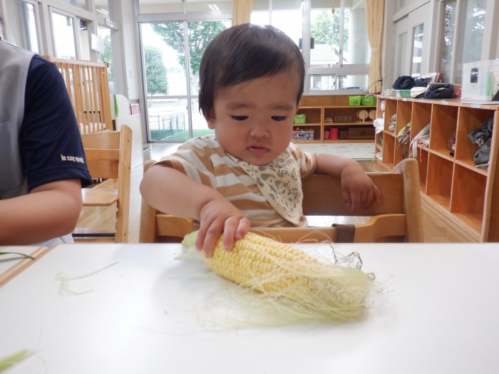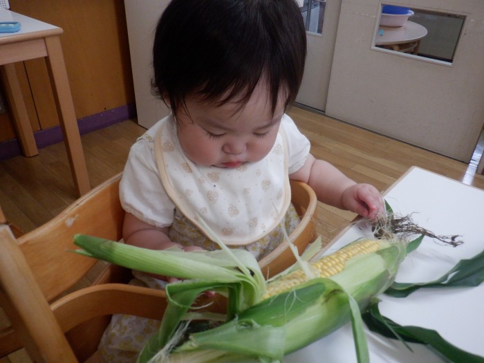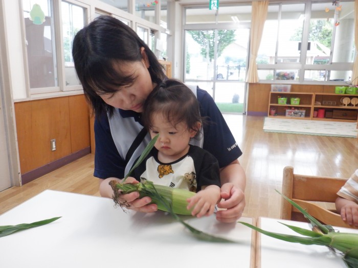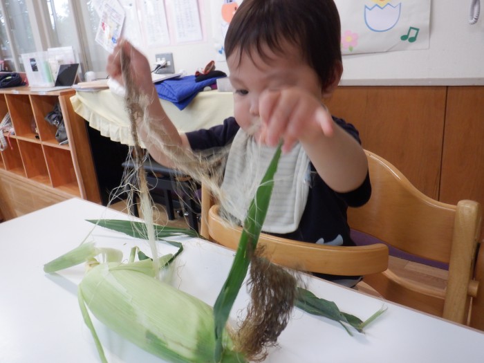 食育でとうもろこしの皮をむきました。最初は初めて見るとうもろこしに戸惑う様子の子どもたちでしたが、指先で触れてみたり、ヒゲを触ったりしながら慣れていき、先生といっしょに皮をむくことができました。