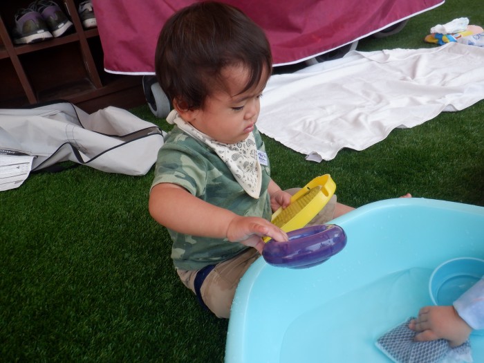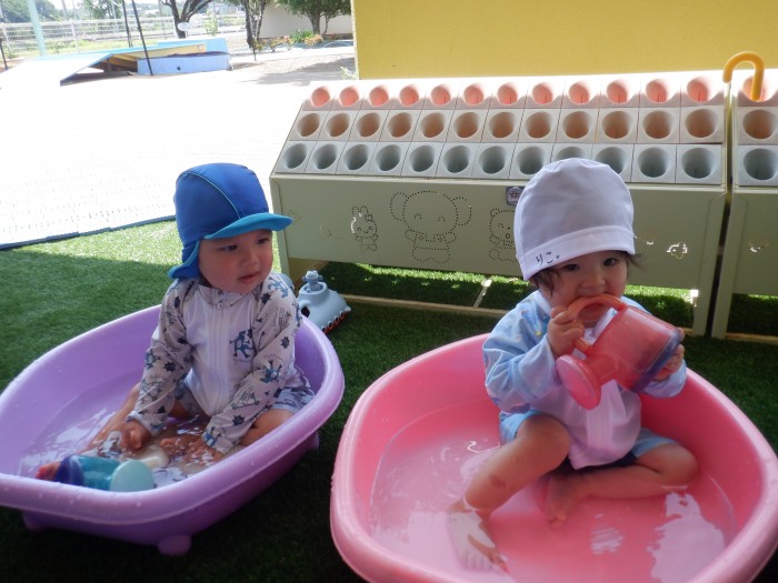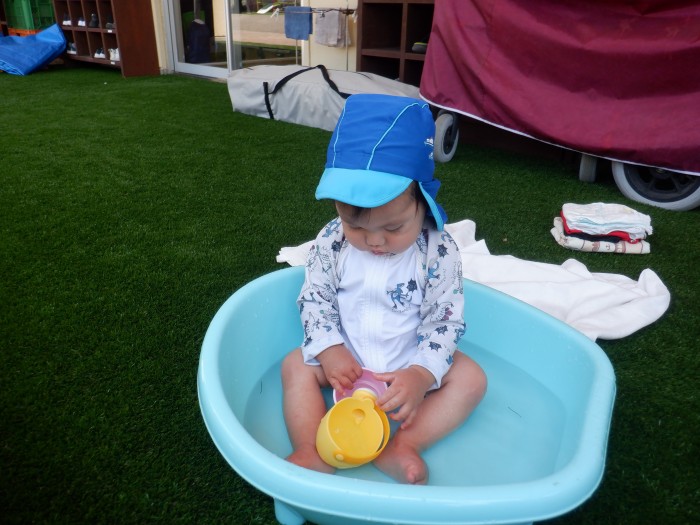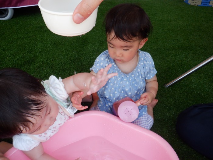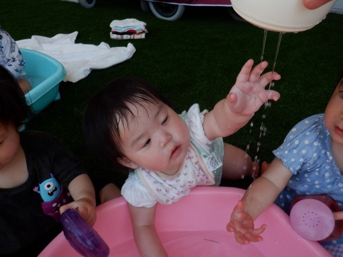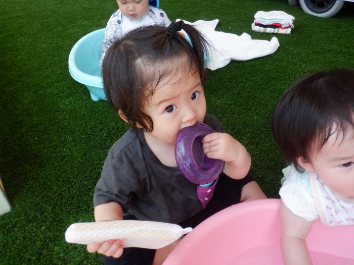 今週はとても暑かったので、水遊びやプール遊びをしました。冷たい水にとても気持ちよさそうな子どもたち。特にシャワーがお気に入りで、ジョウロや穴の空いたカップでたくさん遊びました。