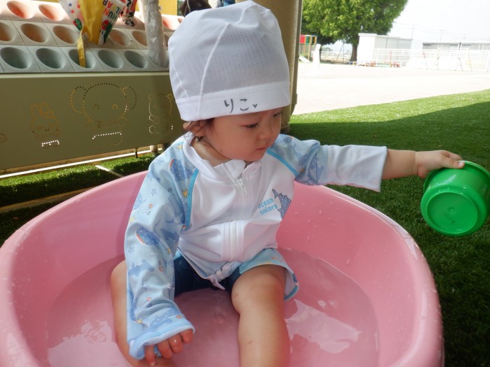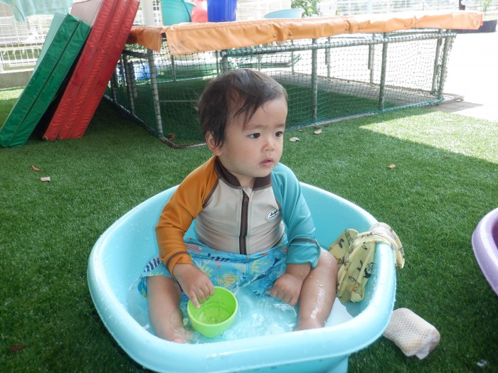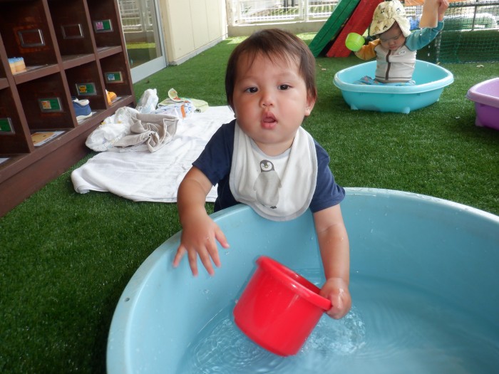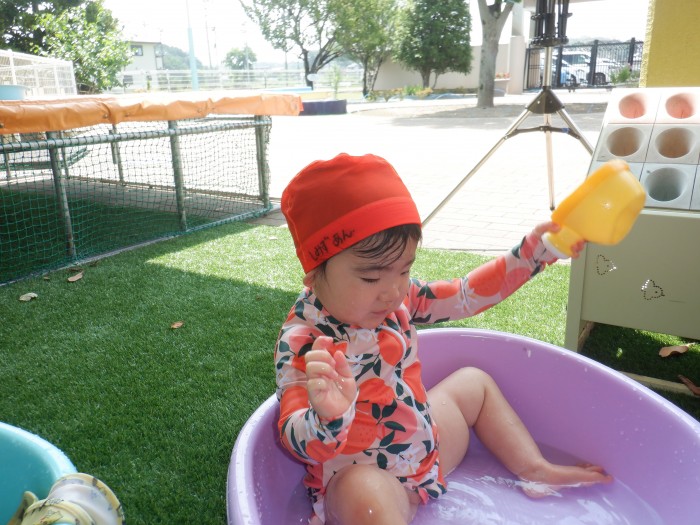 頭から水をかけても泣かずにいられる子も!手や足を動かしてバシャバシャと水面で遊んだり、穴の空いたカップやスポンジで流れ落ちる水を楽しんだりと、思い思いにプールを楽しんでいます。来週以降もたくさん遊んでいきたいです。