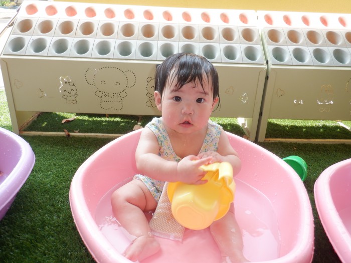 今週も暑い日が続いたので、プールにたくさん入りました。大分水に慣れ、泣かずに遊べるようになってきたつくし組の子どもたち。