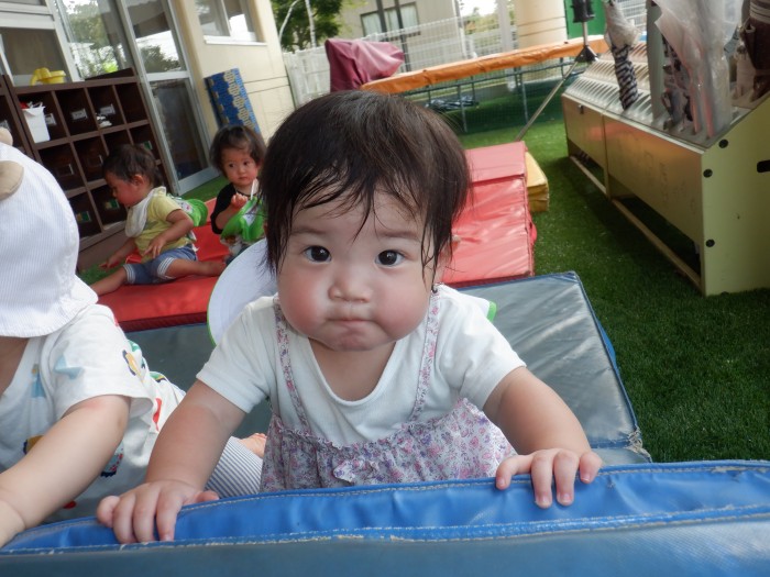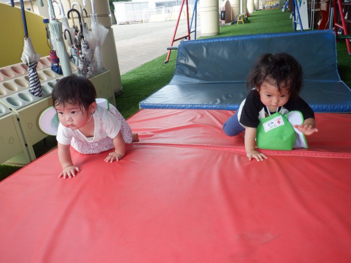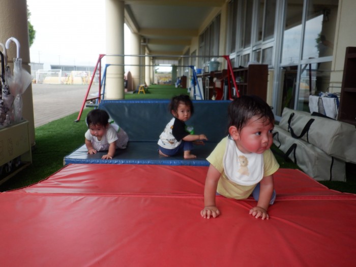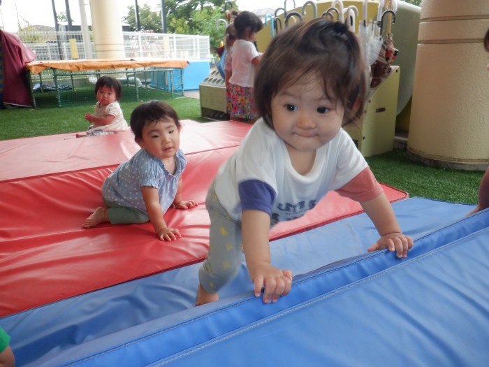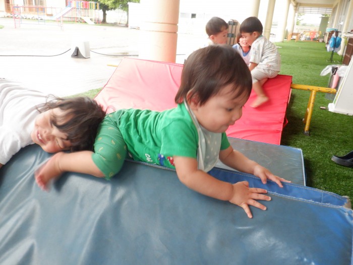 テラスでマット遊びをしました。小さなお山の上をハイハイしたり、平均台のお山を登ったりして遊びました。