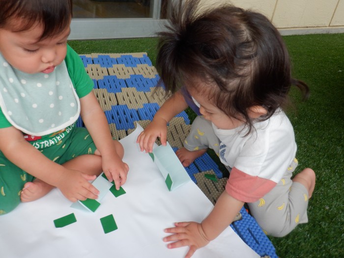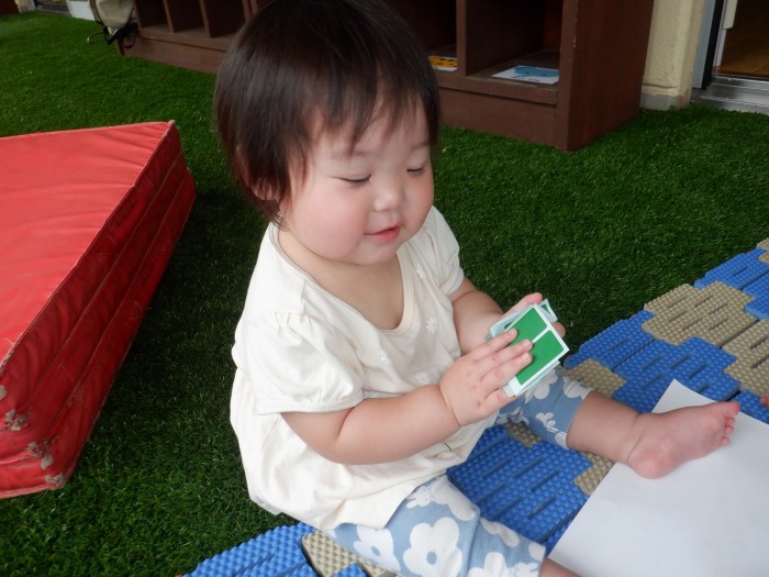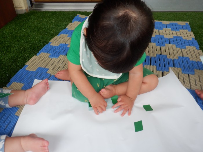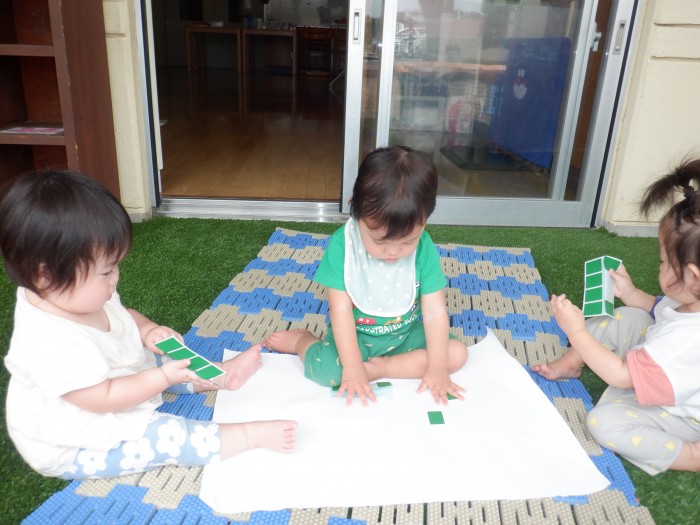 木曜日、久しぶりの雨で涼しかったので、テラスでシール貼りをして遊びました。台紙を折ってシールを剥がしやすくして渡すと、上手にシールをつまんで剥がしていました。シールが手にくっついてしまい、貼るのはまだ少し難しい子もいますが、集中して遊んでいました。